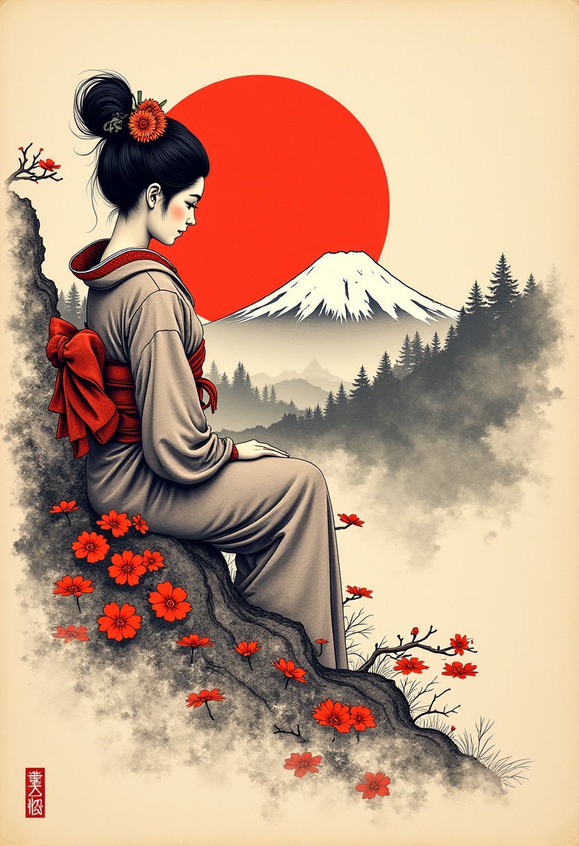 traditional japanese art style, ink on paper, wabi-sabi, henna and carmine, sepia, BREAK, japanese shrine maiden, mount fuji in distance, red sun