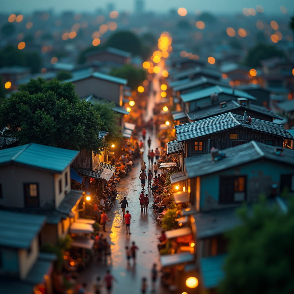 microworld composition, isometric angle, tilshift world,highly cluttered brazilian favela, crowded market, illuminated