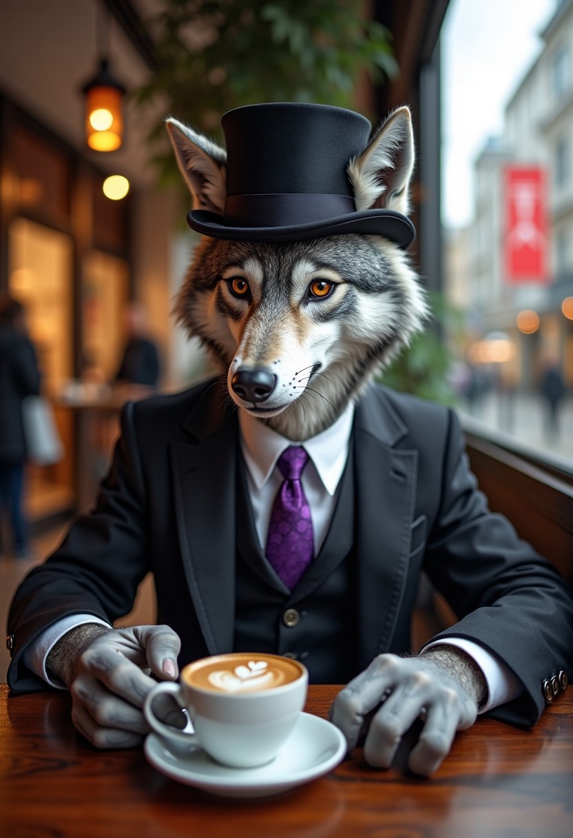 Portrait of an old gray wolf anthro gentleman wearing a classy suit while drinking cappuccino in a cozy cafeteria in a shopping mall early in the morning. The wolf has a purple black silk tie and a top hat.