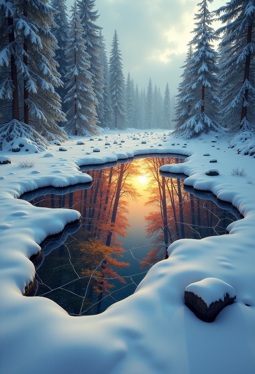 A surreal winter landscape where a giant, cracked mirror lies broken in the snow, its shards reflecting different seasons and times of day. One shard reflects a vibrant spring meadow, another a fiery autumn forest, and another a stormy night sky. The juxtaposition of these elements creates a dreamlike, otherworldly atmosphere. The snow around the mirror is undisturbed, creating a sense of eerie calm. The artwork is highly detailed and imaginative, blending realistic textures with fantastical elements to create a surreal and thought-provoking scene.