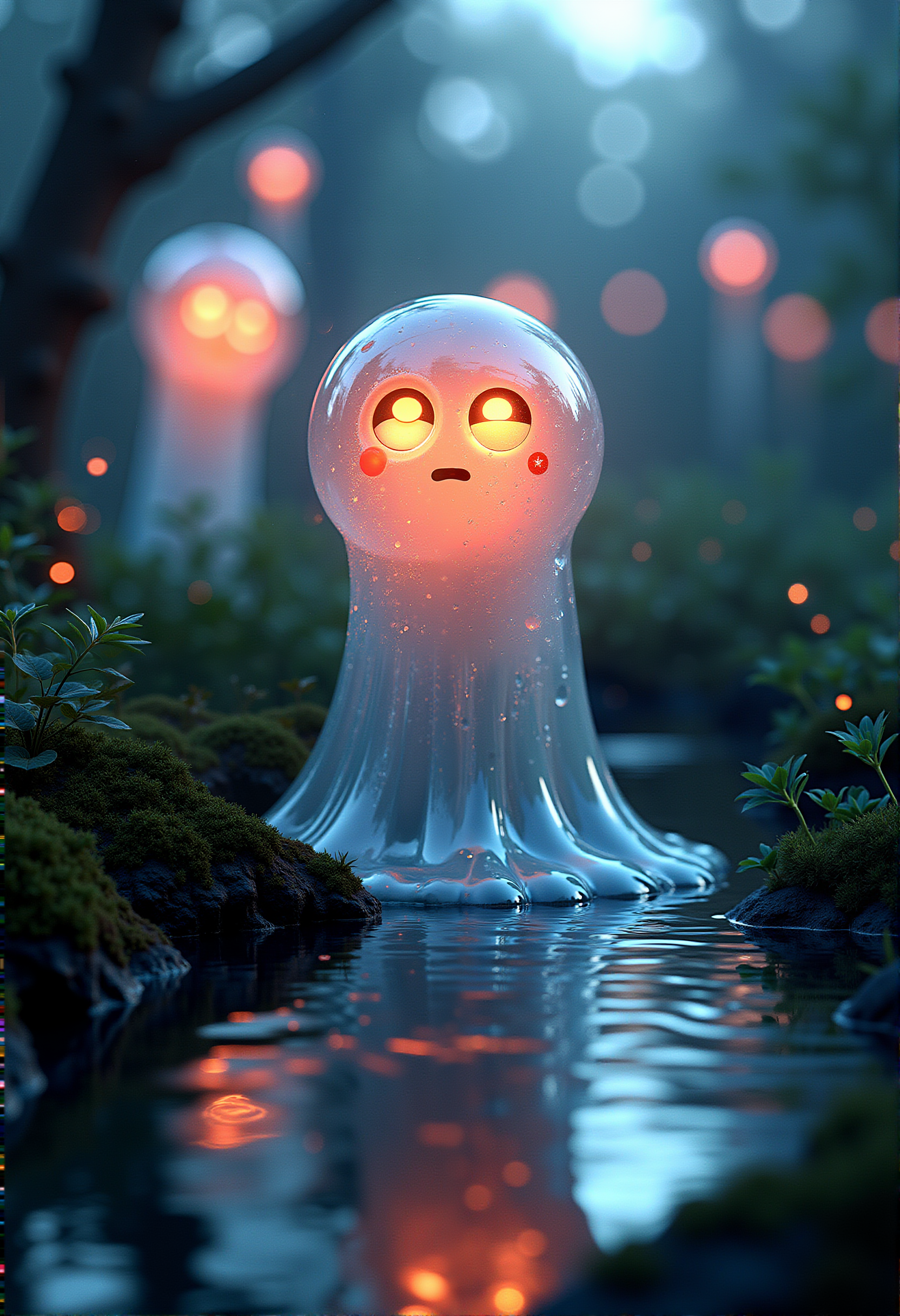 photorealistic image of a dreamy and otherworldly transparent slime with a gelatinous body and bright googly eyes, floating above a small pond, surrounded by glowing orbs, twilight with the last light of day fading, ultra-high-definition textures, cinematic composition, soft and surreal lighting, intricate details in the glowing orbs, smooth transitions between warm and cool tones, mystical and ethereal atmosphere, realistic reflections in the water, detailed foliage with soft shadows, glowing highlights on the creature's body, serene twilight scene, photorealistic rendering