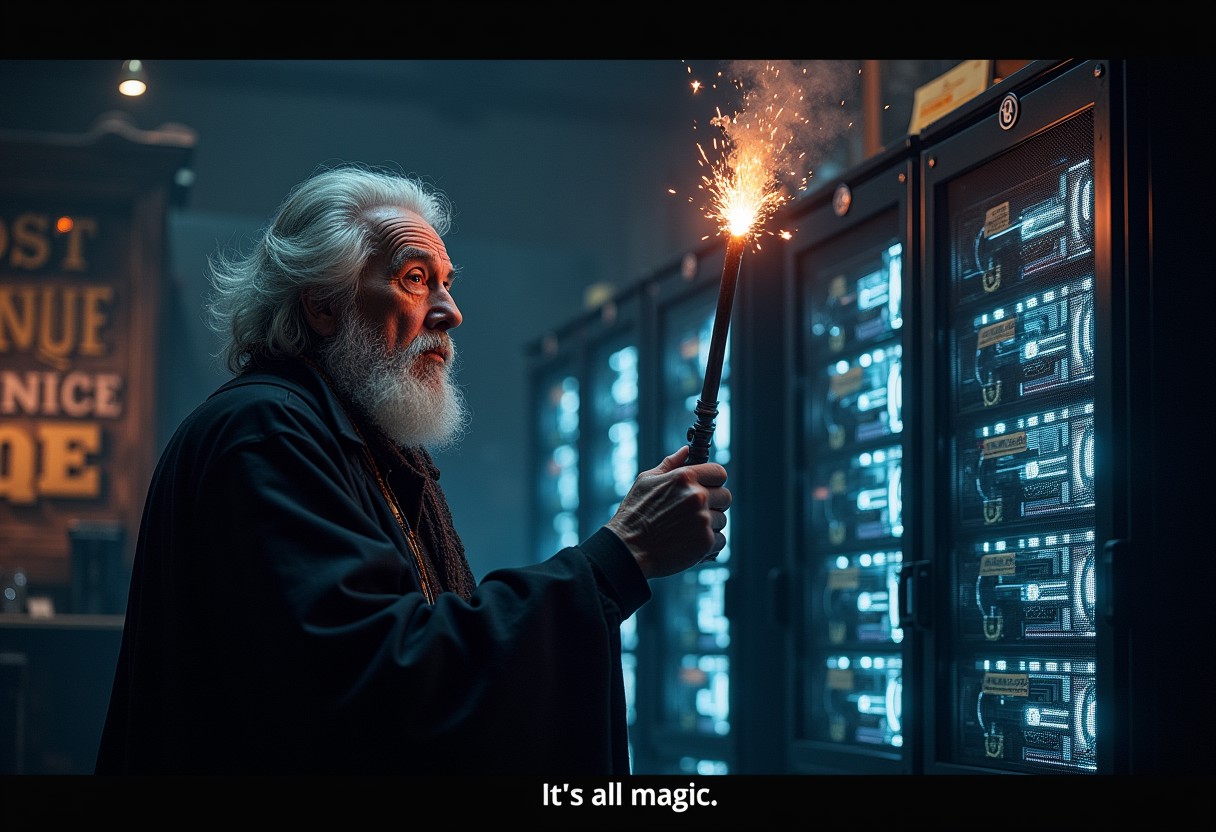 In a dimly lit room adorned with arcane looking text that reads 'Maintenance Mode' and mystical artifacts, an elderly wizard stands before a row of malfunctioning GPU server racks. His eyes glow with determination as he raises his wand, ready to unleash a powerful spell. He focuses all his magic energy, chanting incantations under his breath. Sparks fly from the ends of the wands, illuminating the chaos within the racks. white text watermark across the bottom that says 'It's all magic.'