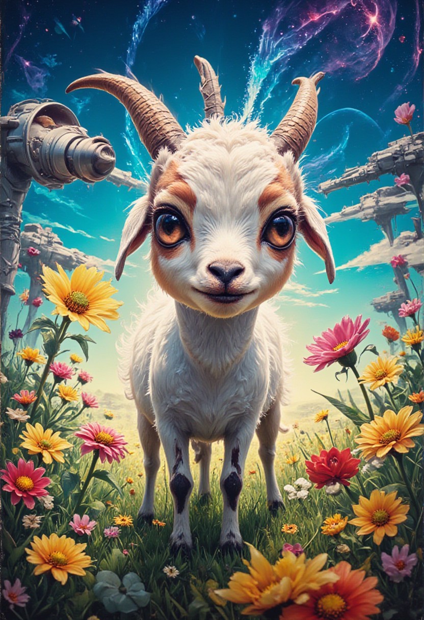 by Magali Villeneuve and Moebius, painting, A vibrant and colorful painting depicts a small, round goat with large brown eyes and a long black beak. The background is a celestial observatory filled with wildflowers, Clear skies, Bokeh, triadic colors, cute wallpaper , detailmaximizer. cute frame