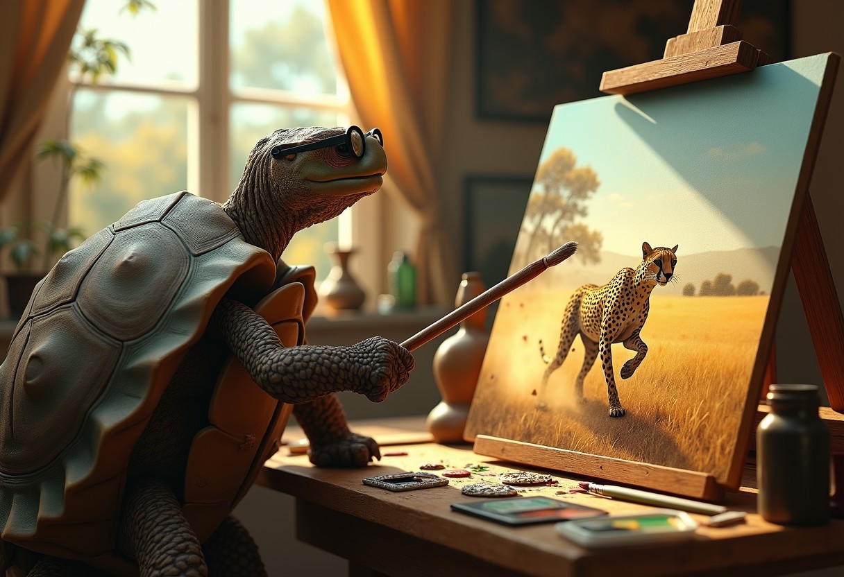 Old national geographic grainy photography, fined grain photo : Inside a sunlit art studio, filled with paintbrushes, easels, and art supplies, a tortoise is deeply engrossed in its painting. The tortoise, wearing paint-streaked spectacles and looking intently at its work, moves its brush with precision. The canvas in front of it gradually reveals a meticulously detailed scene of a cheetah sprinting with incredible speed across a golden savanna, dust trailing behind its swift feet. This scene humorously contrasts the tortoise's renowned slow-paced nature with the lightning-fast speed of the cheetah, offering a delightful and amusing twist on the classic tortoise and hare fable.
