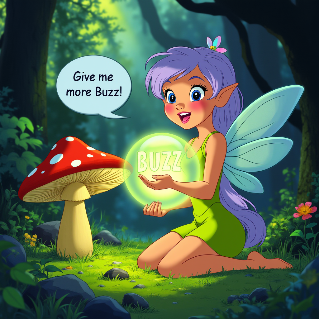 In a magical forest, a fairy girl with translucent wings and lavender hair, holds a glowing crystal orb with the word 'BUZZ' carved into it. The orb's light dims as her companion, a talking mushroom, exclaims, 'Give me more Buzz!' in a speech bubble.