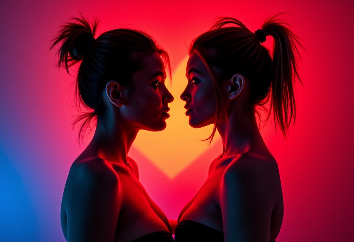 ultrarealistic, 8k, masterpiece, 2girls, big breasts, silhouette, silhouette of a heart formed be woman's figures, big breasts, nipples, neon, bright and dynamic composition,vibrant color palette, dramatic lighting, ethereal atmosphere, giving a piece sign,