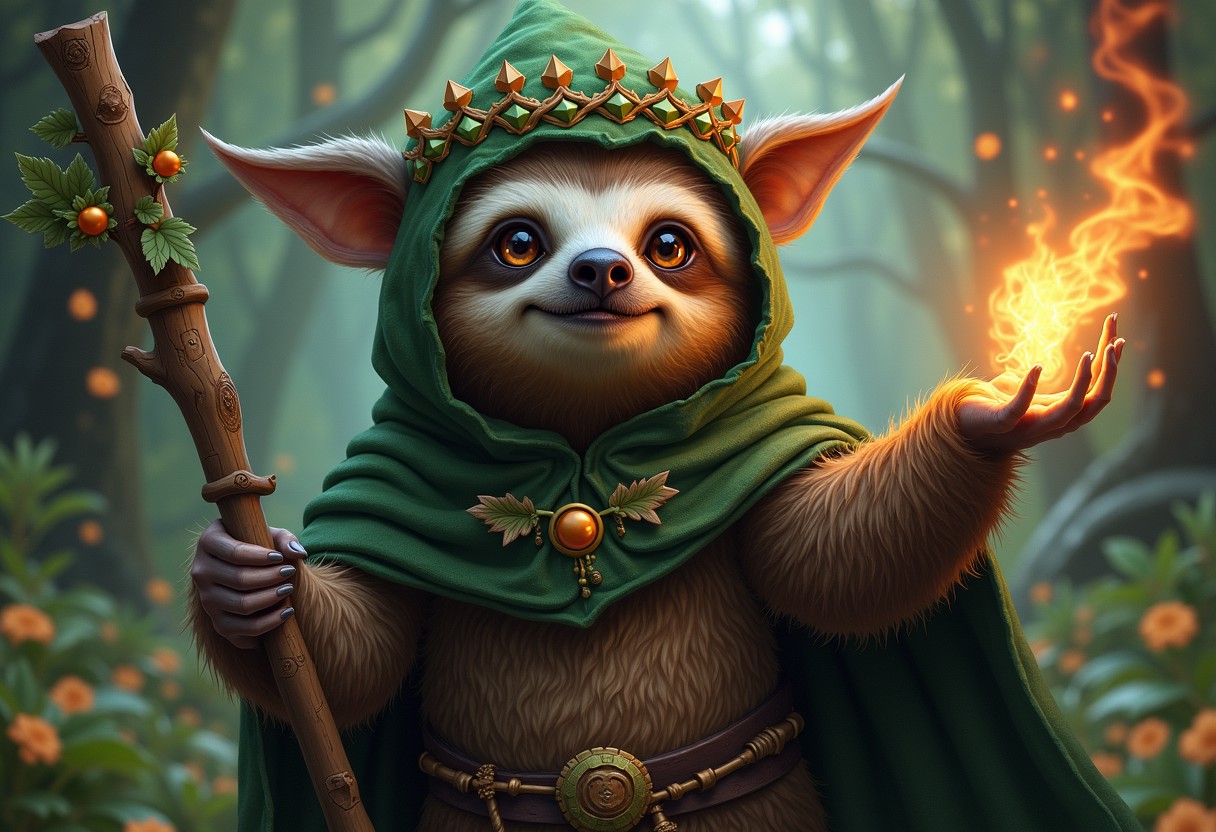 A sloth wizard wearing a druid crown and cape and casting spells with a wooden staff