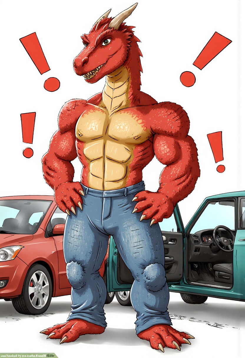 A muscular dragon man wearing jeans is standing behind a car in w1k1h0w cartoon style. He has exclamation marks around him.