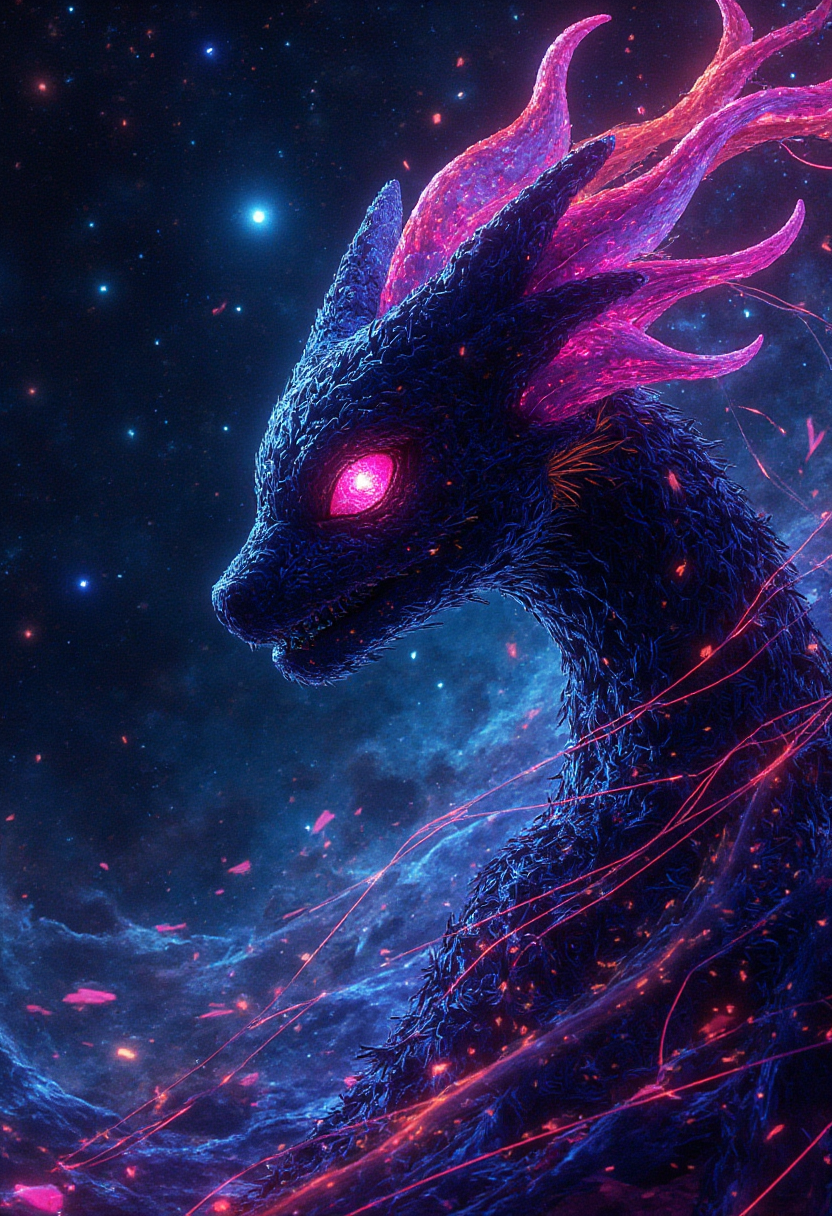 picture of the year award,100bh-style,space background with galaxy, dark style pop surrealism, Pop Art, minimalism, Bw-grignani, Closeup Portrait, An Abstract surreal dark colorful simple painted eternal Closeup Portrait of requaza pokemon,big huge,Illuminate the fusion of artistry and innovation in this mesmerizing image bailing_glitch_effect, atmospheric haze, Film grain, cinematic film still, highly detailed, in Action Pose Silhouette, made of lines, vertical lines, horizontal lines, Portrait Made of intertwining lines, weaving over and under each other throughout the frame, emphasis effect, moire effect, awash in colorful shades, seamlessly extends the lines, Motion lines, , extremely detailed