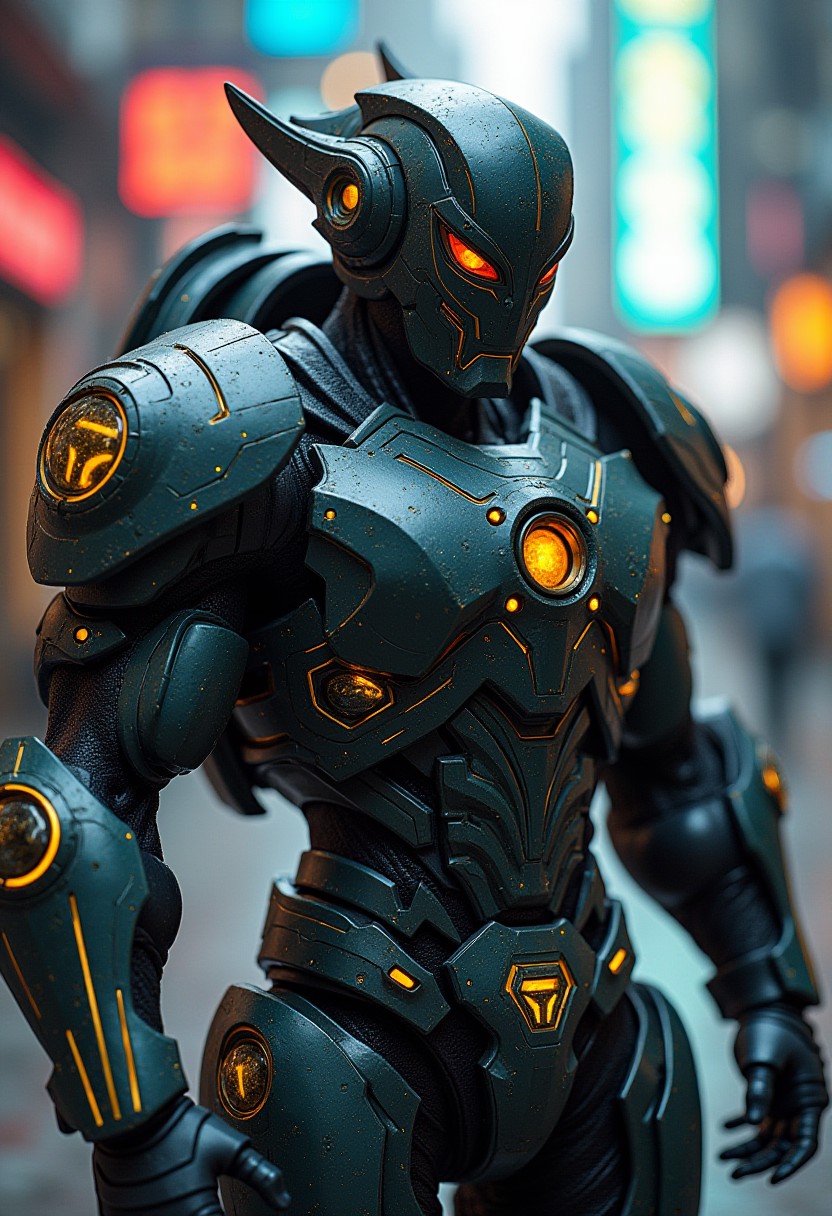 A muscular man in bulky intricate futuristic mecha armor, hannya mask, cyberpunk style, cinematic shot, depth of field, bright colors