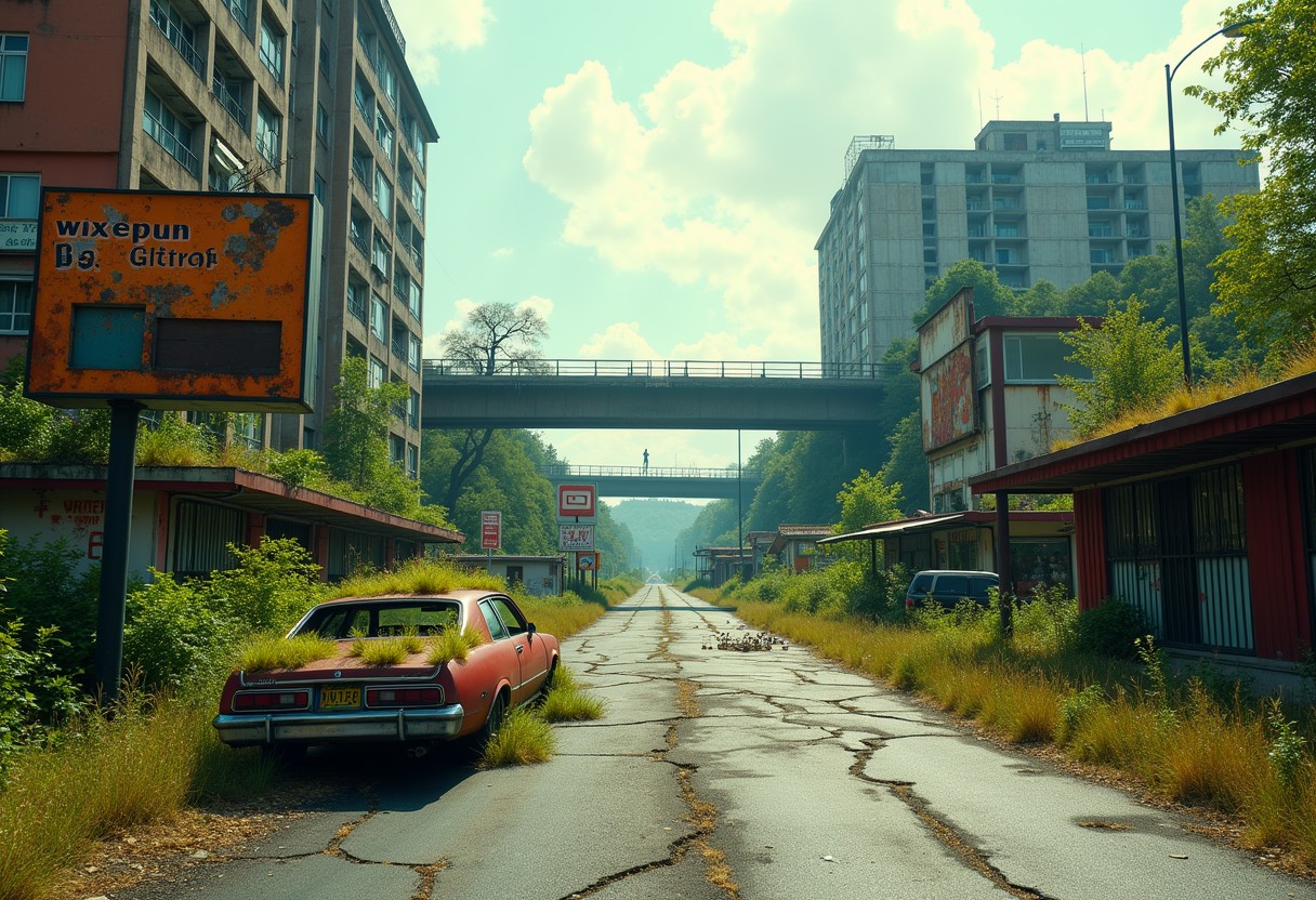 A cinematic photography of Post-apocalyptic city overtaken by nature, traces of former humanity, rusty destroyed billboards, cracked asphalt, a ruined bridge in the distance, streets overgrown with plants, a playground, a restaurant with broken windows, vivid colors, spatial light, abandoned destroyed cars overgrown with grass, Canon EF 50mm f/1. 8 STM Lens, cinematic, realistic, photography, masterpiece, many details, high quality