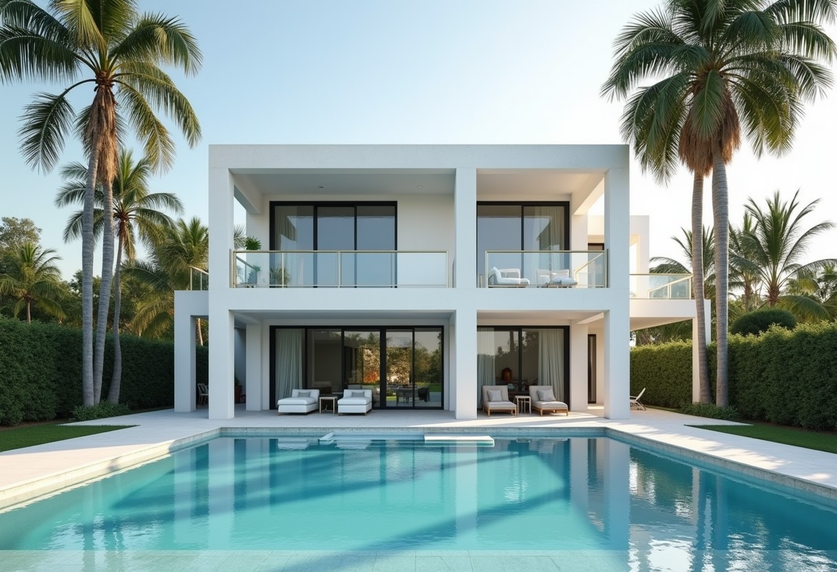 nice house, palm trees, two floors, white walls, flat roof, simple pool on the back