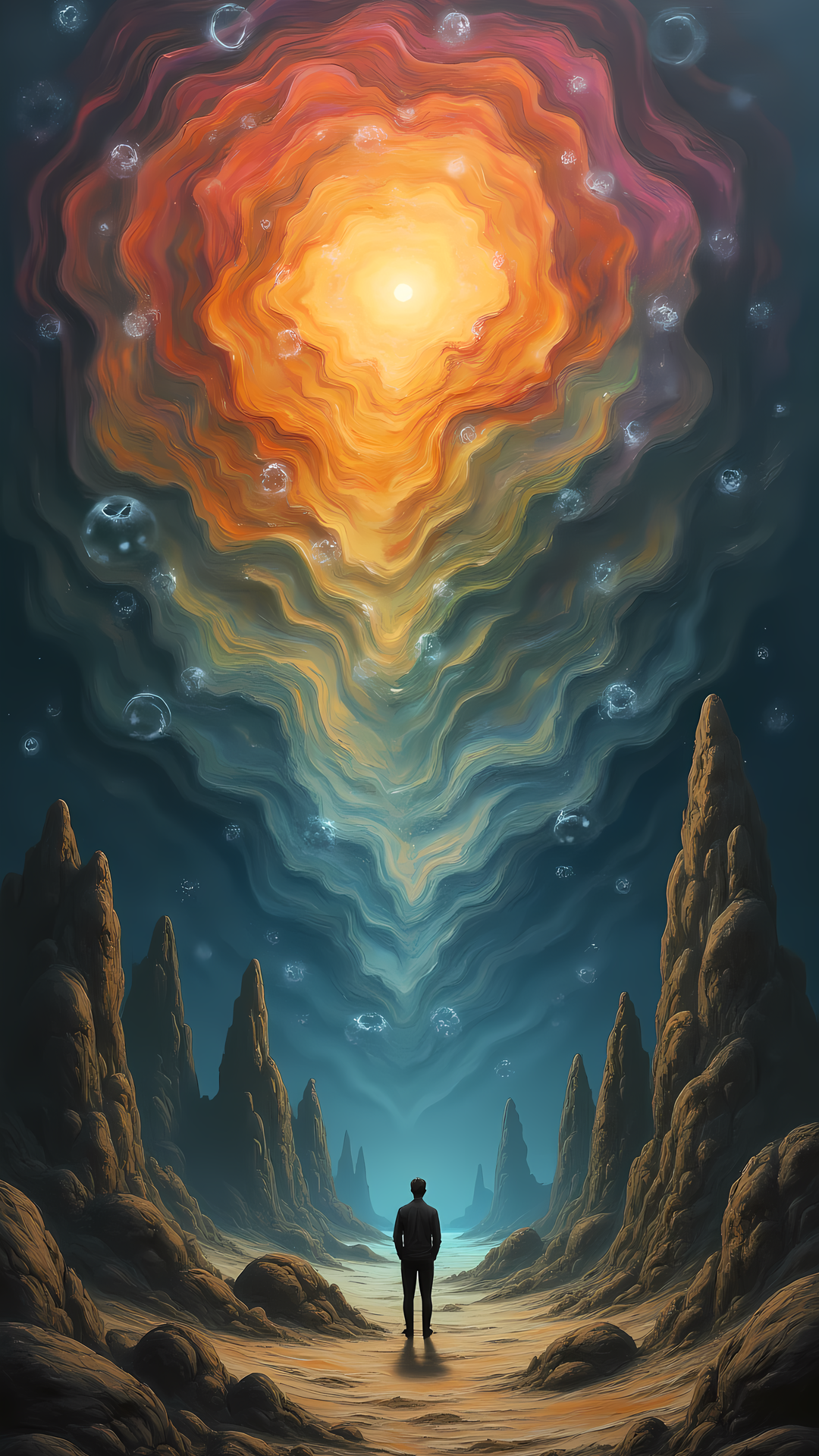An impressive work of surrealistic art. Mysterious effects are spread across the image, forming an abstract, dreamlike landscape in colorful tones. In this complex drawing, everything seems lost in thought, projecting a subtle impression onto the intricate motif. The contrast between the image's elements invites the viewer to contemplate the themes of appeasement, creation and the delicate balance between the natural and human worlds. The dreamlike quality of the work encourages introspection and a deeper understanding of the interconnectedness of all things.