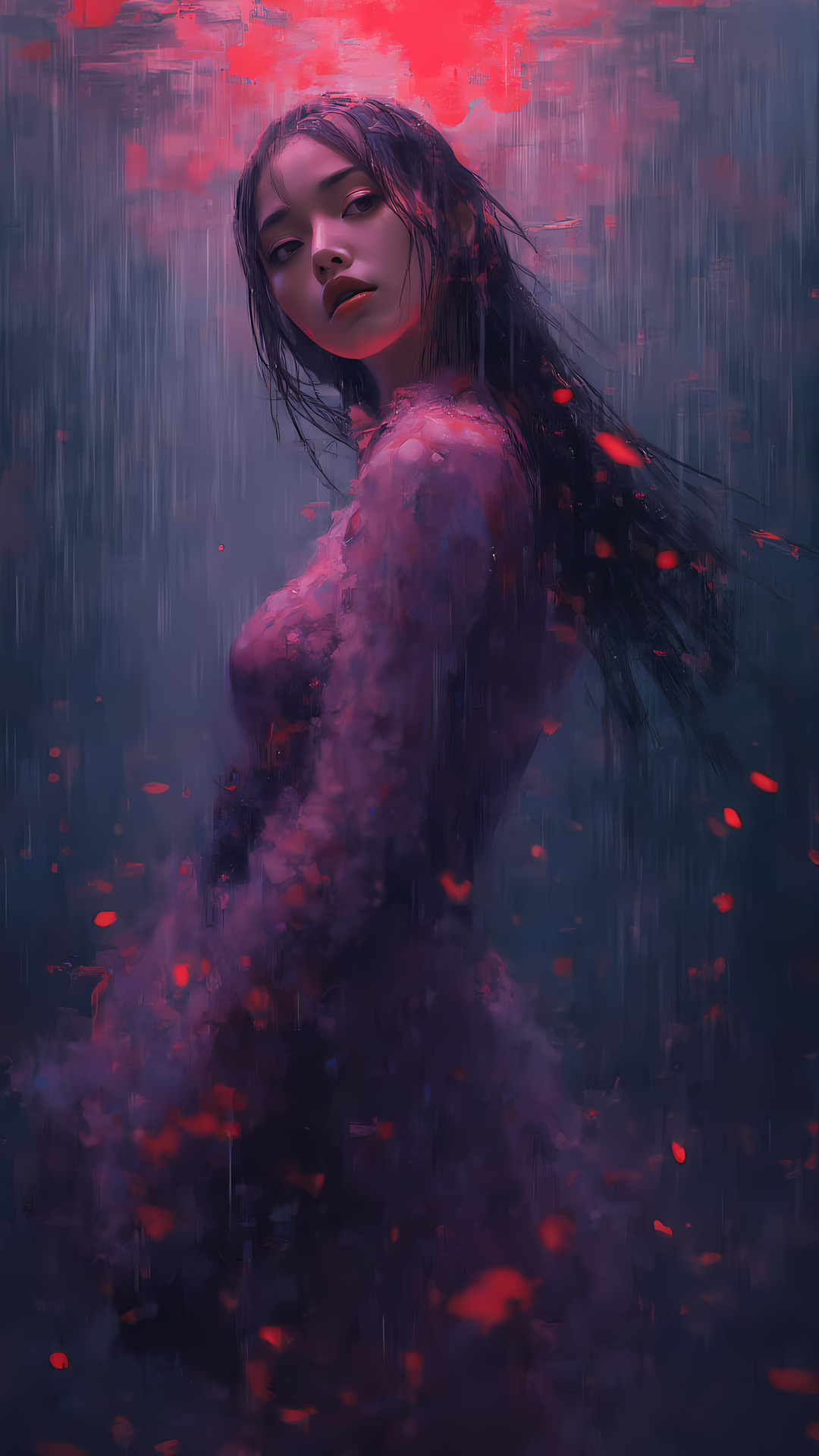 An impressive surrealist work of art of an elegant young woman in kimono sinking in water. Mysterious effects are spread across the image, forming an abstract, dreamlike futuristic deep ocean in shades of purple, red and blue.In this complex design, everything seems to be lost in thought, with the rain casting a subtle impression on the intricate pattern