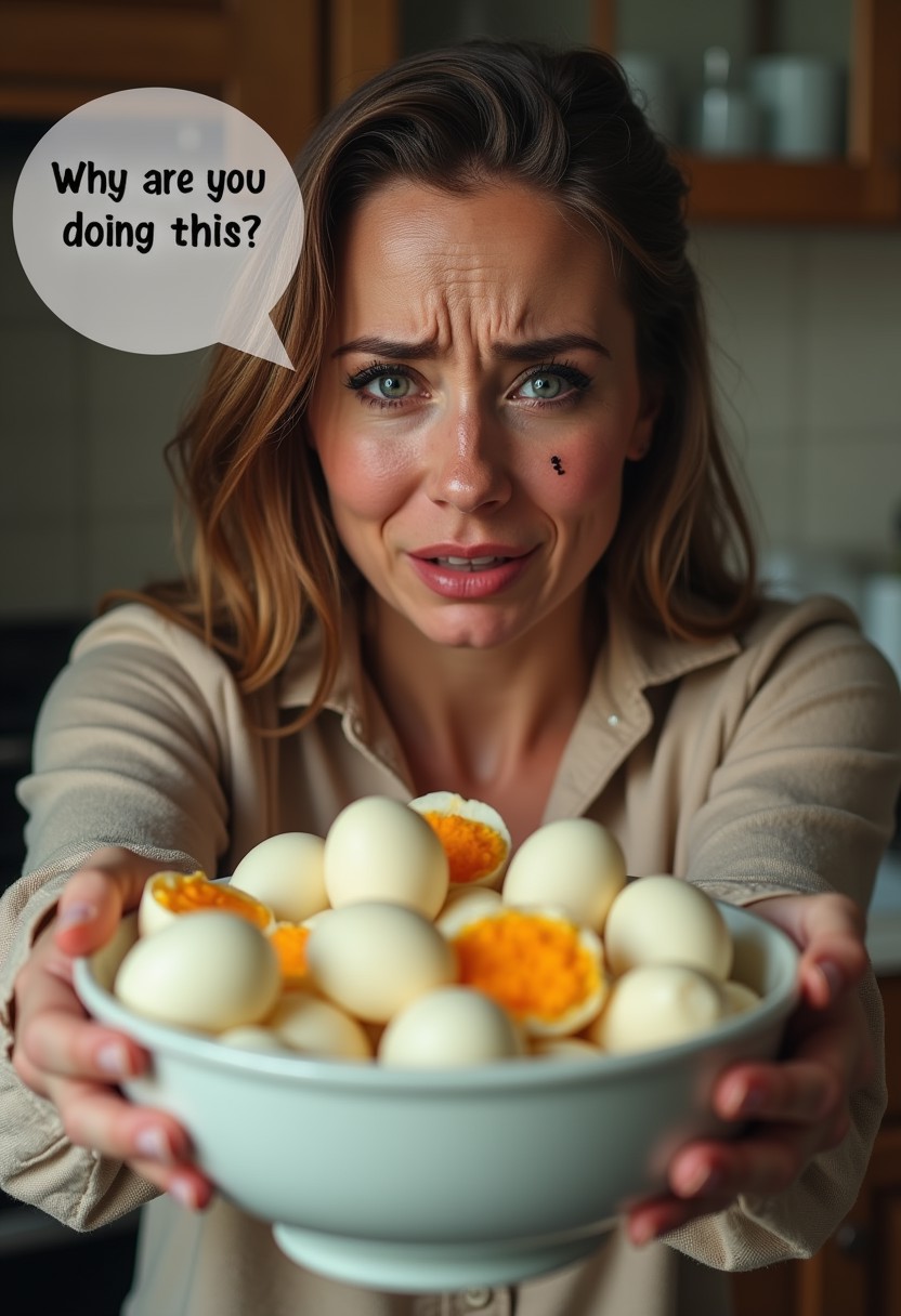 A woman being handed a large bowl of peeled boiled eggs, crying woman, visibly distressed, with ruined makeup and running mascara, looking at viewer, pleadingly, a speech bubble coming out of woman saying "Why are you doing this?!", kitchen background! masterpiece, realistic, highly detailed,