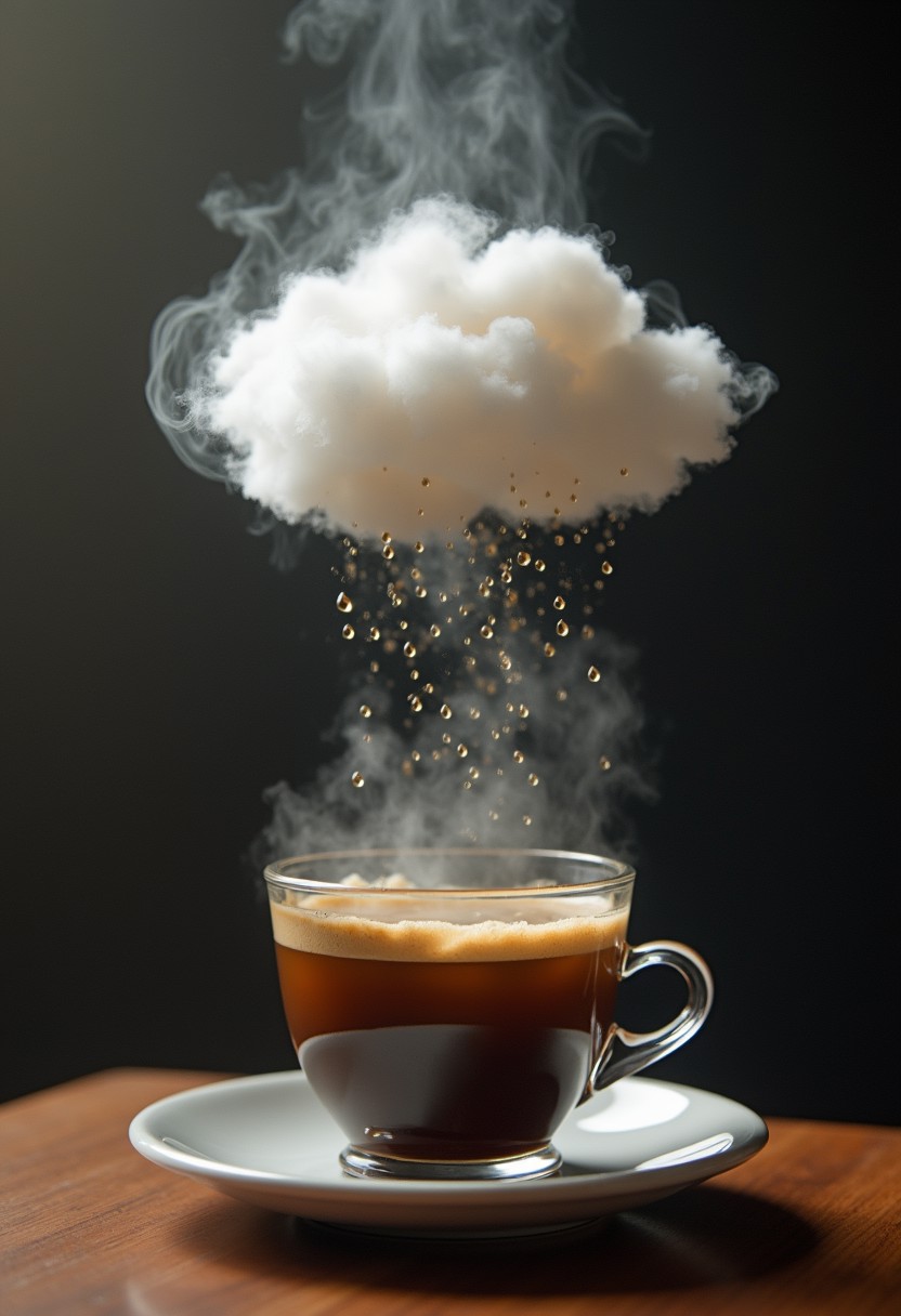 A cup of coffee where the steam forms a cloud, raining tiny droplets back into the cup, in a self-sustaining cycle.