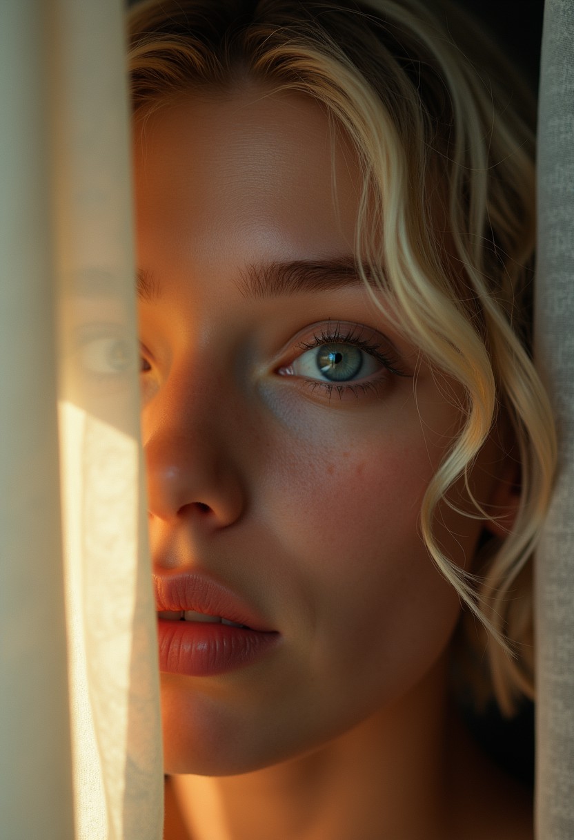 RAW photo, beautiful eyes, upper body shot, masterpiece, peeking from behind curtains, colorful details, award winning, high detailed, 8k, natural lighting, analog film, detailed skin, amazing composition, intricate details, subsurface scattering, short blonde hair, laced hair, amazing textures, filmic, chiaroscuro, soft light