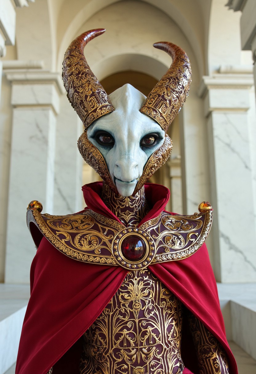 Upper body portrait, in the style of dark white and light bronze, gold filigree, fierce alien priest on an alien planet, adorned with garnet and bloodstone gemstones, standing in ancient white marble temple, by Brian Froud and Heather Theurer, extremely detailed head and face, very realistic and symmetrical eyes, (eye contact with viewer), hyper detailed, hyper quality, artstation award winner, Epic realism, meticulous masterpiece The most compelling work of art ever produced, every intricate detail holding a narrative or philosophical concept that entrances. The entire composition is lauded by the modern masters as truly mesmerizing, the artwork itself considered by some too sacred to even show the common world. The work is dynamic and complicated, with multiple forms of media layered in complex and innovative ways, at times mind-bending in the creative solutions the artist found to produce what is lauded as the only truly creative work ever produced by mankind