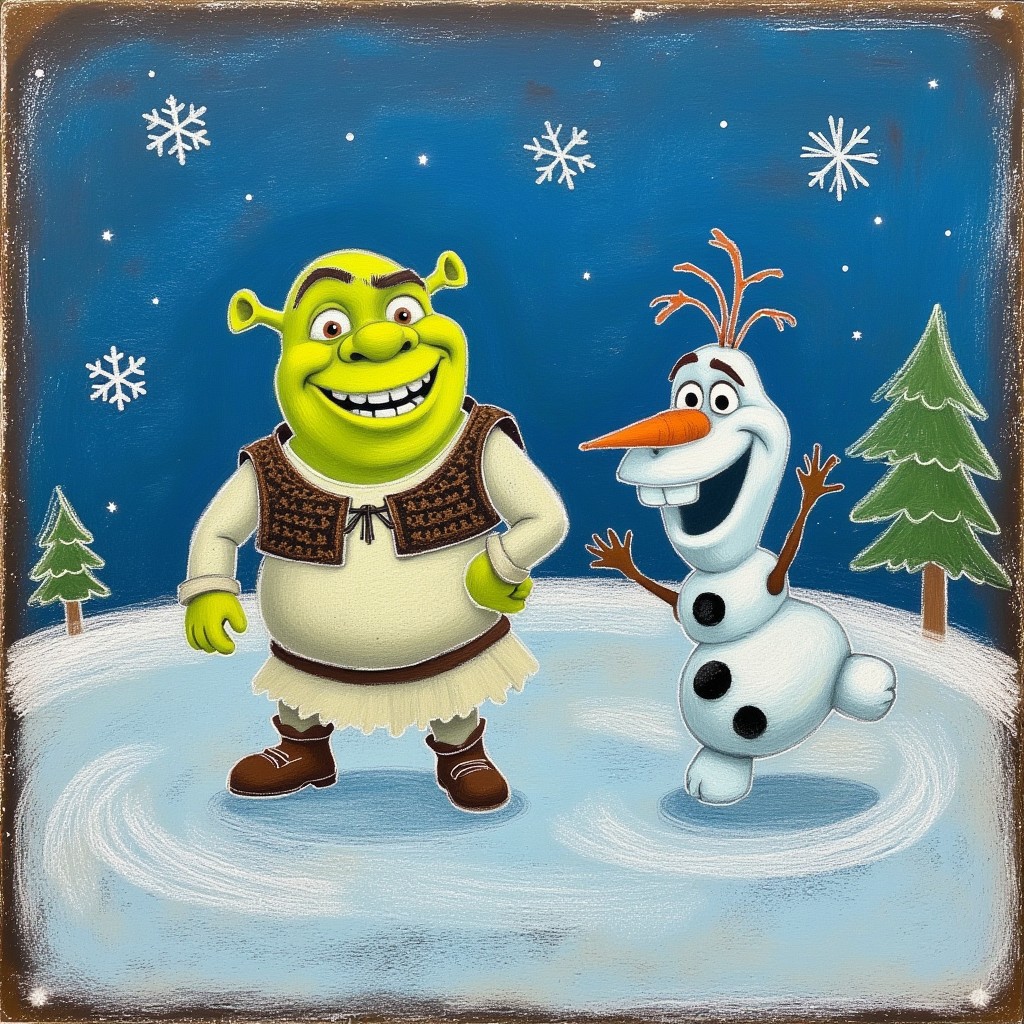 A silly ChalkBoardDrawing of Shrek and Olaf on a frozen field