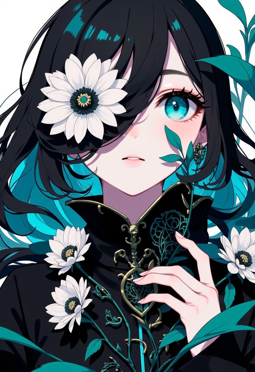 1girl, anime girl, abstract style, completely black suit with ornamental details, only details on the face, close-up shot of his turquoise eyes, flower, one eye covered, (intricate details, (incredibly detailed), high detail, ultra-detailed), (hyperdetailed), (soft focus:1.1), absurdres, (hires textures), (4k), (masterpiece, best quality), fca_style