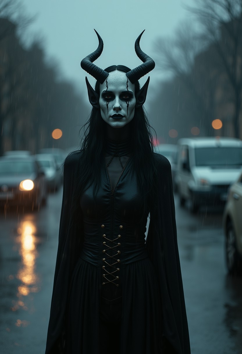 Modern pop culture Dark Elven Maiden standing in t he rain, (black ink tears from eyes),tears, close-up, dark clouds, rain, water puddles and cars, street, emotional scene, realistic, cinematic lighting and dramatic atmosphere,plain white mask:2, tears,theatrycal mask,sad, demon, smoke, smoke in the backround, smoke clothes,