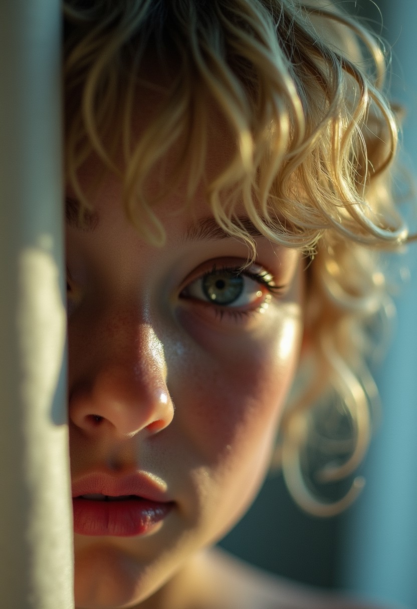 RAW photo, beautiful eyes, upper body shot, masterpiece, peeking from behind curtains, colorful details, award winning, high detailed, 8k, natural lighting, analog film, detailed skin, amazing composition, intricate details, subsurface scattering, short blonde hair, laced hair, amazing textures, filmic, chiaroscuro, soft light