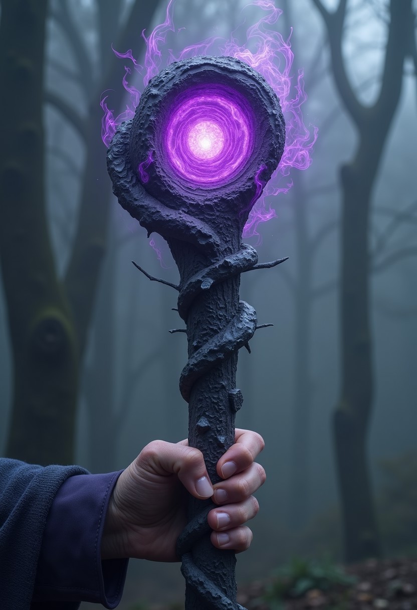 Old national geographic grainy photography, fined grain photo : Picture a staff carved from a piece of dark, otherworldly stone, its surface covered in ancient, glowing purple runes that seem to shift and change when looked at directly. The staff’s top is crowned with a swirling vortex of shadow and light, from which tendrils of dark energy extend, curling and snapping in the air like living entities. A hand grips the staff, with shadowy tendrils wrapping around the arm, giving the impression that the staff is drawing its power from an unfathomable void. The background is blurred into a nightmarish landscape of swirling mists and dark skies, with the dynamic energy of the staff creating an eerie, foreboding atmosphere.