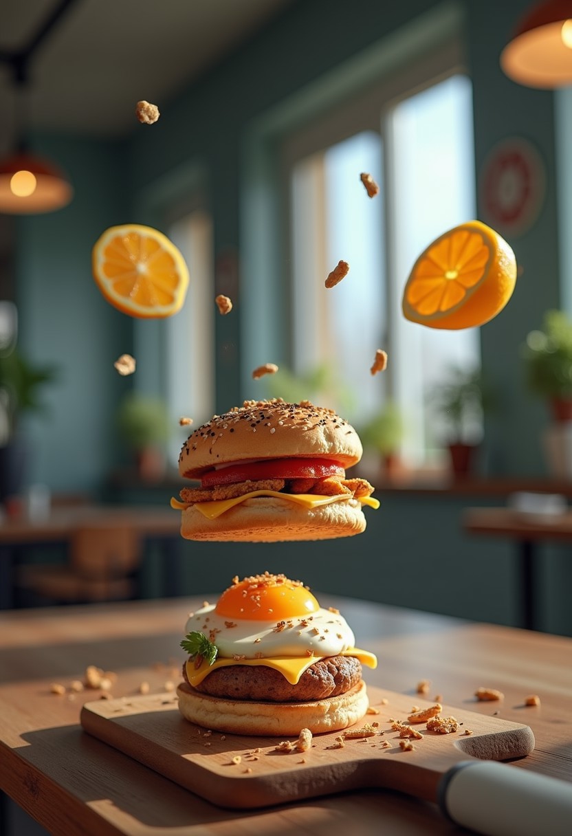 realistic advertising photo of a healthy gym breakfast flying products