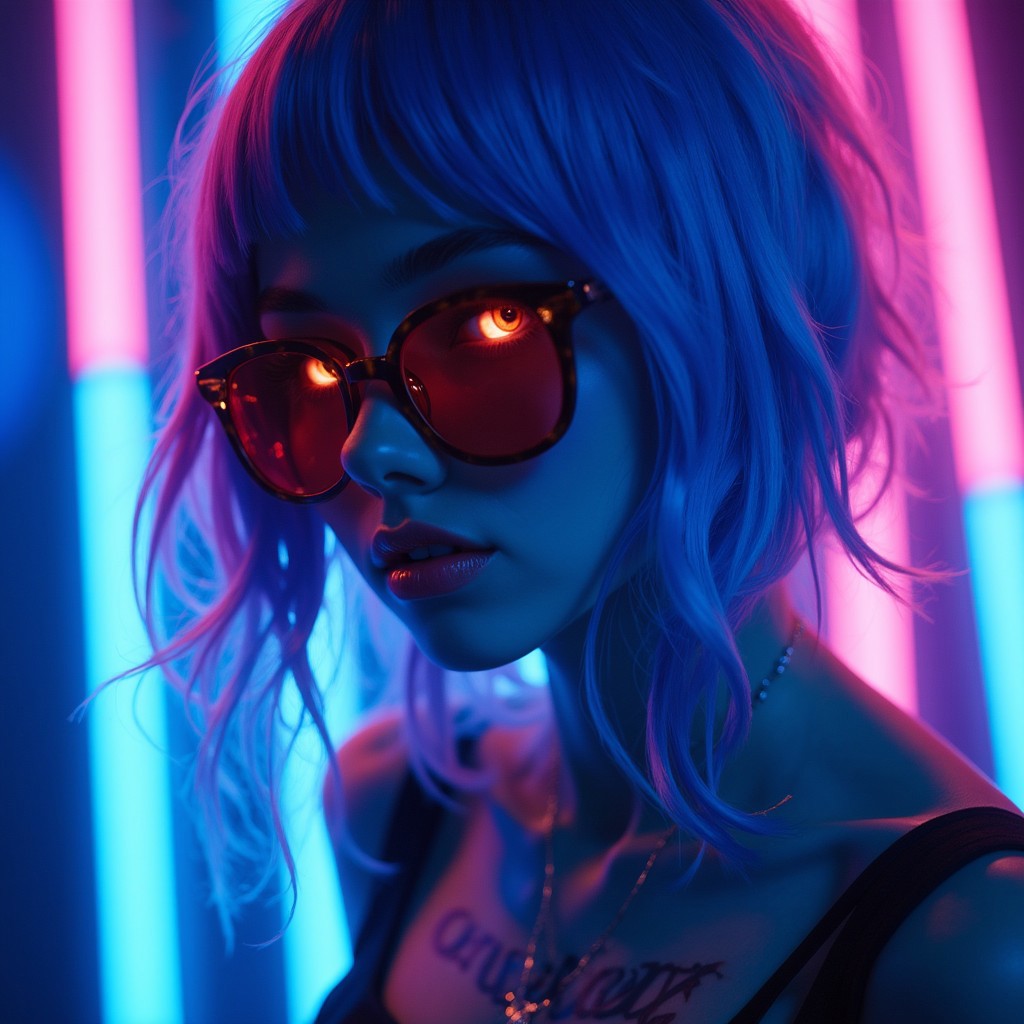 a cyberpunk girl cast in blue and pink lighting with bold hair color and sunglasses, she has a neon tattoo that says flux detailed