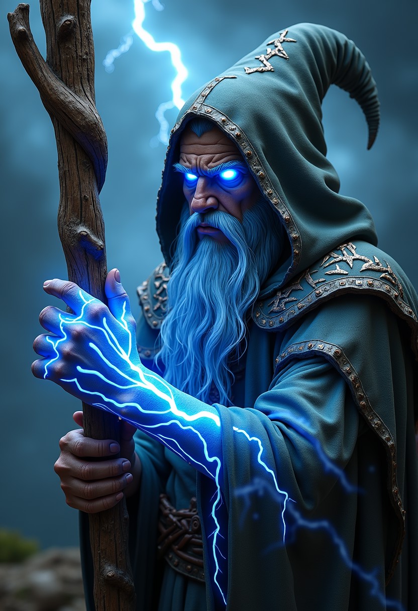 Old grainy photography, fined grain photo. Cursed Stormcaller Wizard BustStaff: Twisted oak staff, intricately carved with glowing blue lightning runes that crackle with electric energy. The staff’s surface is rough, with embedded crystals that pulse in sync with the lightning.Visual Elements: Electric tendrils wrap tightly around the hand and arm, sending small sparks into the air. The wizard’s eyes glow an intense electric blue, matching the energy of the staff.Clothing: High-collared, storm-gray robe adorned with metallic threads that shimmer like lightning bolts. The robe is tattered at the edges, giving the appearance of having weathered countless storms.Cursed Detail: Dark, jagged lines spread from the wrist to the neck, crackling with residual energy as if the curse is alive and feeding off the storm’s power.Background: A dark stormy sky with flashes of lightning illuminating the dramatic scene.