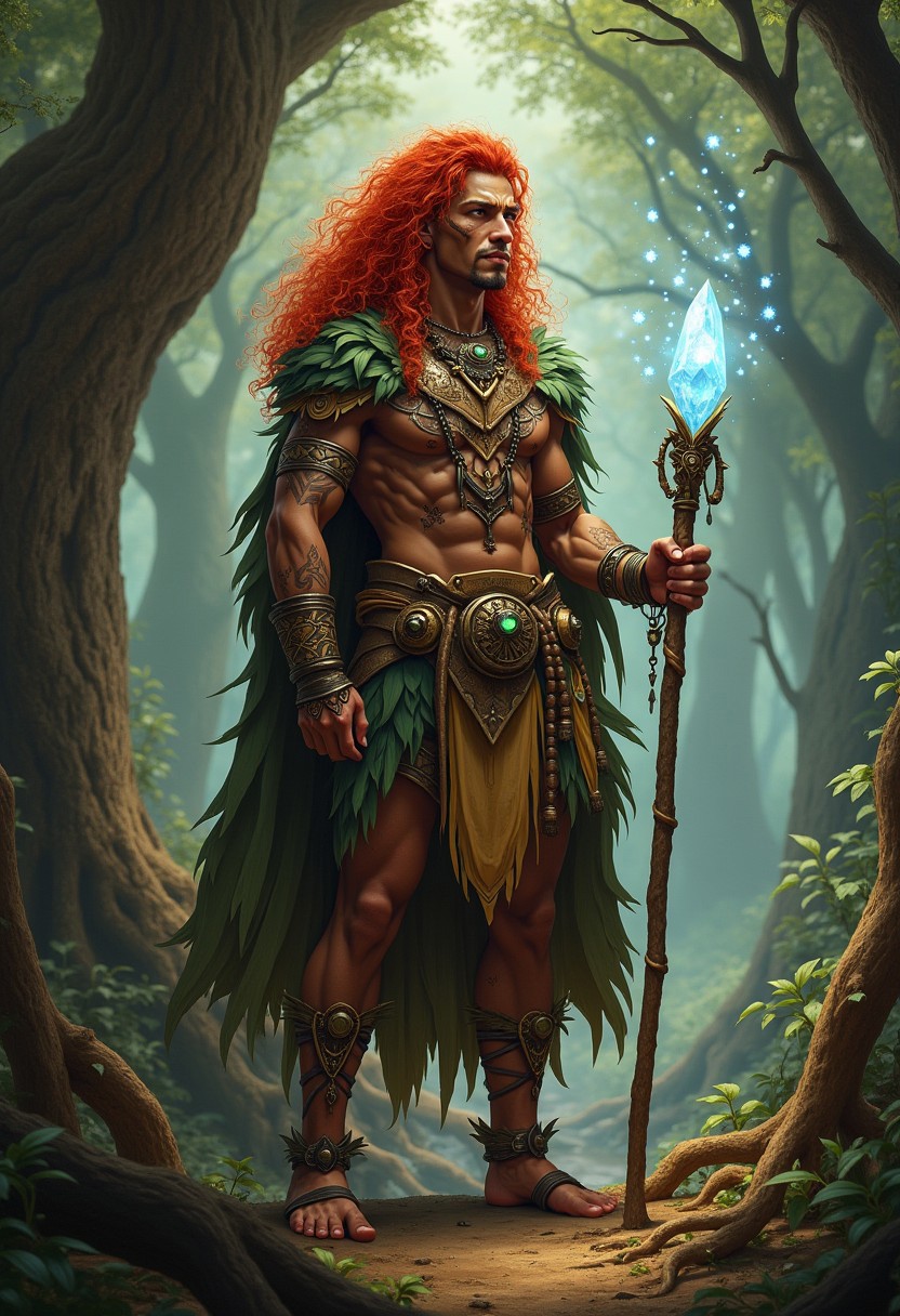 A fantasy shaman with fiery red curly hair, depicted in a highly realistic style. He wears a cloak made of woven leaves and feathers, and his face is painted with intricate, tribal designs. He stands at the edge of a sacred grove, holding a staff topped with a glowing crystal. The trees around him are ancient and massive, their roots twisting through the earth. The air is filled with floating, glowing symbols and the distant sounds of chanting. Hyper-detailed, realistic, vibrant colors, mystical atmosphere.