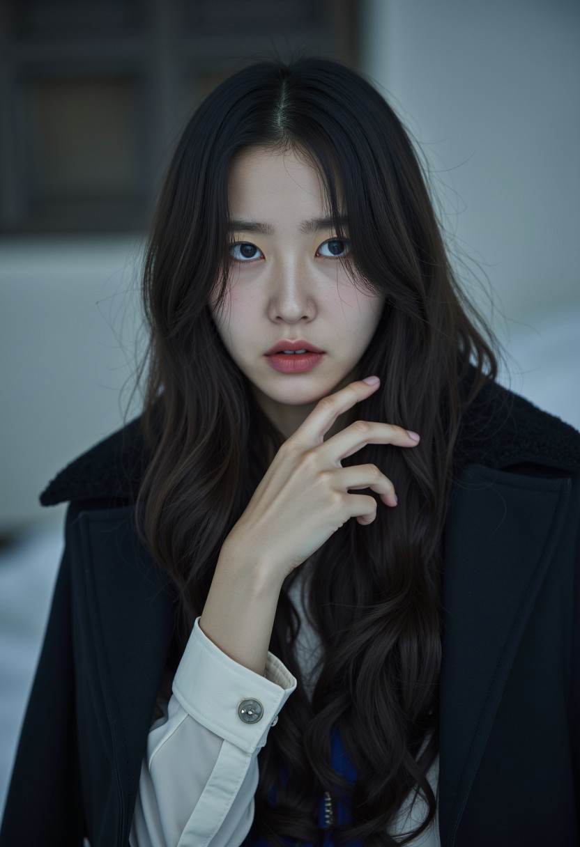 A melancholic Korean 1girl stands against a cold, industrial backdrop, her gaze lost in space. Her pale hands, captured in an emotional gesture, tell an unspoken story. An ultimately mega crazy complicated detailed super UHD wallpaper-level mega-highest-quality photo that has very fine shadows and detailed pixel features, with a microscope-level of intricate details. Her skin, hair, eyes, lips, and clean natural short nails are shown with extremely fine with soft natural face without makeup, 32K-level pixels for incredible realism. This visual masterpiece, using Pulitzer Prize-level photography skills, skillfully uses light and shadow to capture her stunning beauty and her deep emotions with amazing detail and lifelike accuracy, similar to the precision of microscopic cell photos.