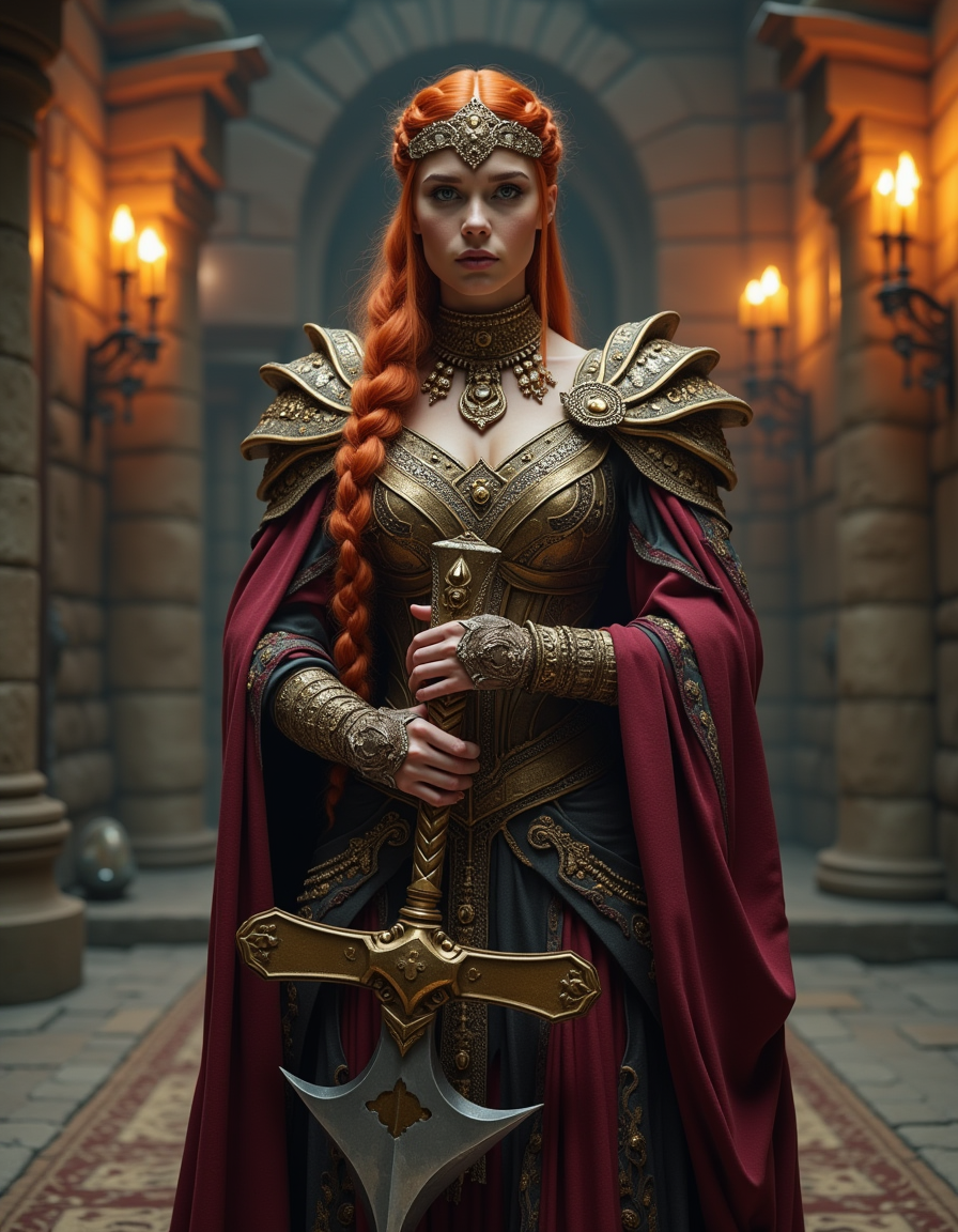 Noble Dwarven Queen adorned in elaborate jewels, braided auburn hair, holding a gleaming warhammer, standing within a grand stone hall with flickering torchlight, medium shot, 70mm lens, photorealistic detail, UHD resolution, volumetric light.