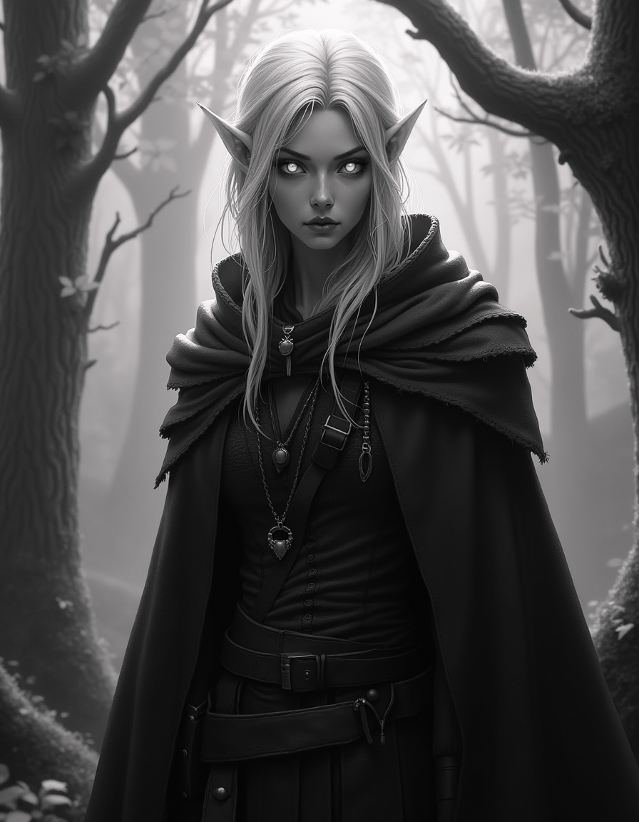 Black and white portrait, A mysterious elven ranger with glowing eyes and silver hair, dressed in a tattered dark cloak, set against a misty, enchanted forest. The atmosphere is serene and otherworldly, in Fantasy Art style, digitally illustrated with intricate detailing and soft lighting effects. bnw, B&W