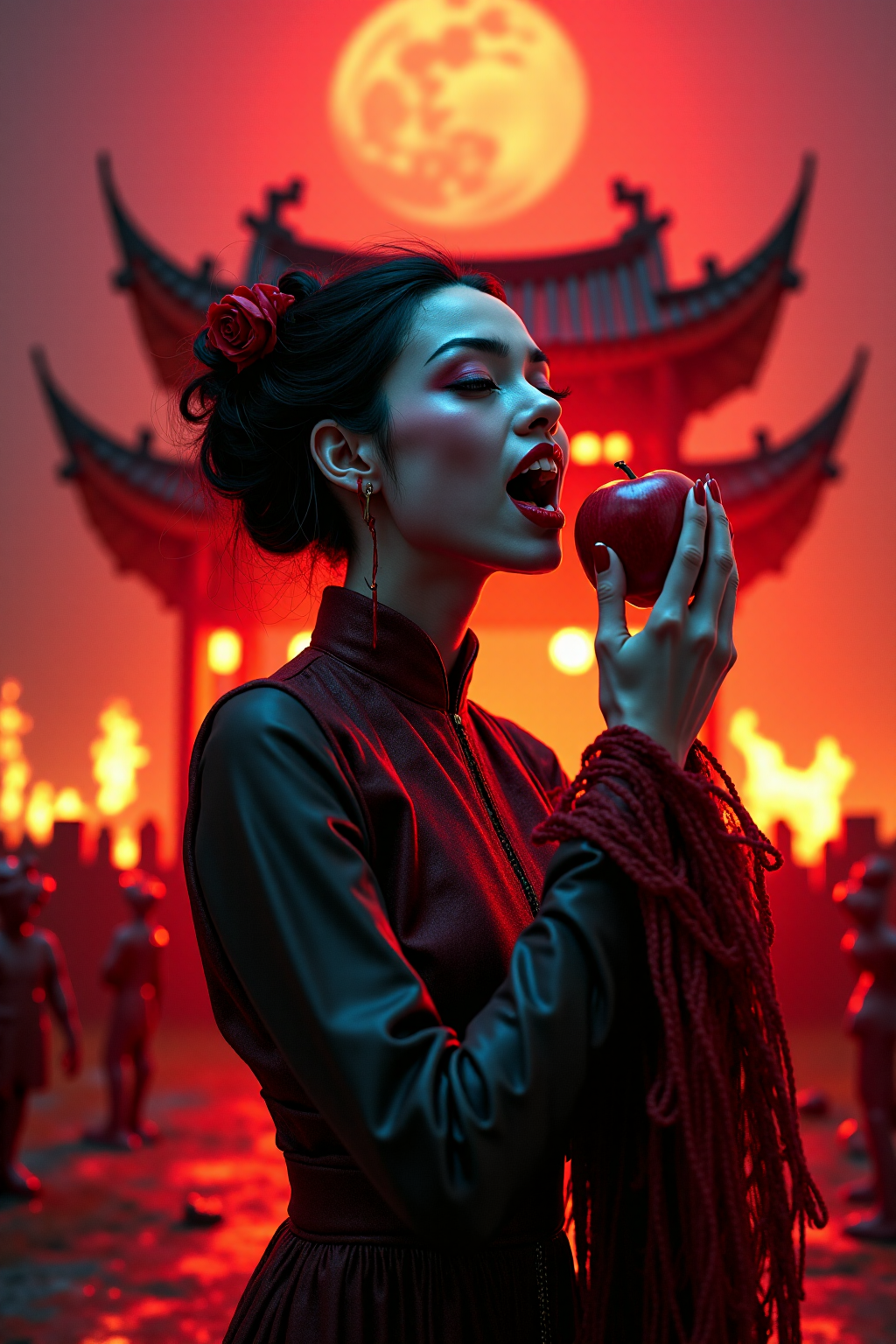 A full body cinematic panorma shot of a women. She is a vampire with pale skin, a jiangshi. She is wearing a amazing jiangshi costume and traditional chinese shoes . Blood is on her face and blood dripping from her mouth. Her fangs are out and she is bitting into an apple she is holding with the right hand. Her head is tilt back. She is looking at the viewer. In the background a chinese temple with emphasize of theatrical elements with extreme opposition of bright colors against dark can be seen. bonfires are lit in the temple. A moody backgrounds under a dark red sky,