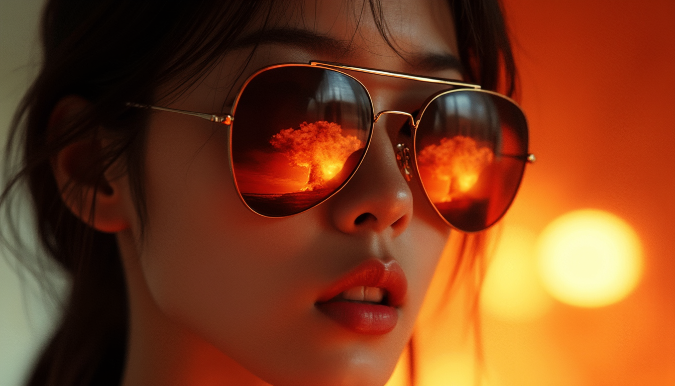 Intense lighting casting deep shadows across a Korean woman's features, wearing sunglasses. The image of a nuclear explosion and mushroom cloud is reflected in both lenses of her aviator sunglasses.
