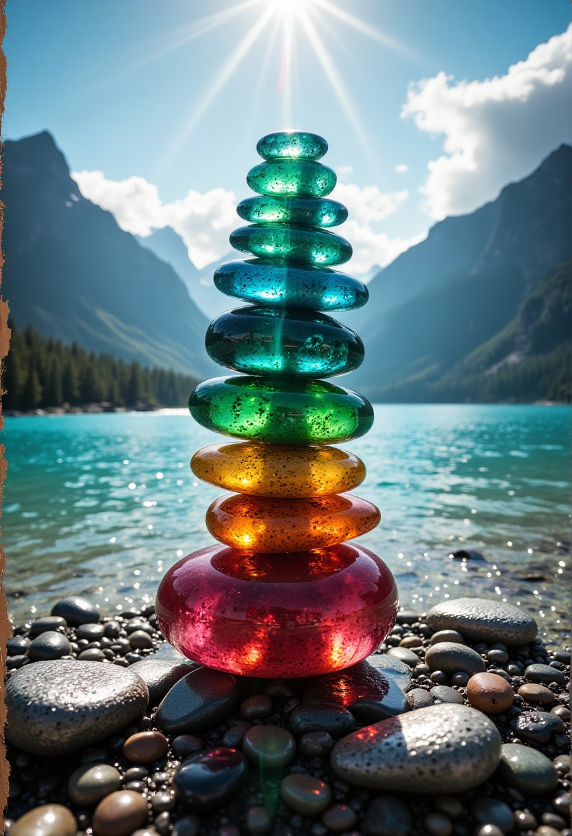The Moment a rainbow crosses a Translucent vibrant Rainbow leaf green Stones stacked into a tower, a towering pile of translucent vibrant natural pebbles seamingless embedded in the towering Background Mountains, Crystal water waves in Background, reflection, Mountains and Clouds Landscape, Blue Sky, cozy light, cinematic lighting, volumetric lighting, Film grain, cinematic film still, shallow depth of field, highly detailed detailmaximizer,gaming, magic silver frame, bronze object