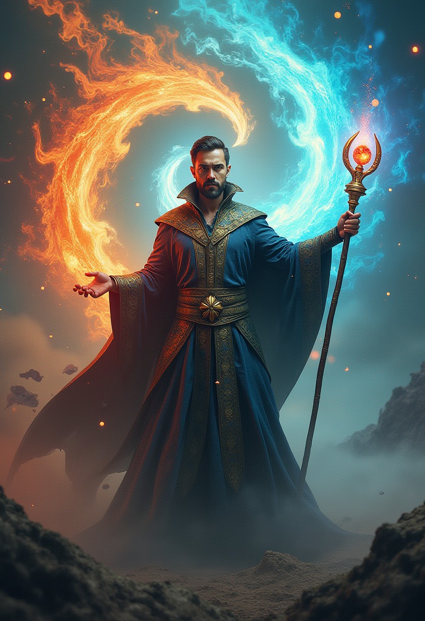 Fantasy portrait of an elemental mage, harnessing the power of all four elements, standing at the center of a swirling vortex of fire, water, air, and earth, wearing an ornate robe that shifts in color with each element, eyes glowing with an otherworldly light, one hand holding a staff with a glowing crystal, the other hand controlling the elements, dramatic and powerful atmosphere, high contrast, vibrant and dynamic colors, camera settings: aperture f/2.0, shutter speed 1/250s, ISO 100.