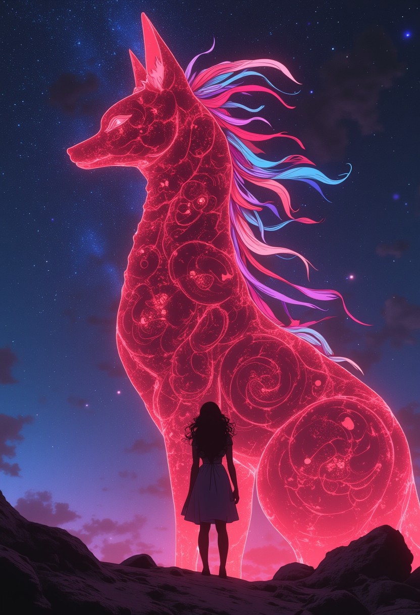 In a photograph reminiscent of the 1980s and 1990s, a woman’s silhouette stands against a towering, ethereal fox-mononoke with seven tails. This translucent, dark-red entity, filled with a blood-like substance, boasts intricate, cybernetic patterns inspired by Ghost in the Shell. Its multicolored ribbon tails trail behind, blending with the neon-lit night. The Milky Way’s cosmic backdrop adds to the scene’s blend of ancient and futuristic elements. With atmospheric haze, film grain, and a shallow depth of field, this highly detailed, high-budget cinematic scene evokes the epic, gritty feel of classic anime.