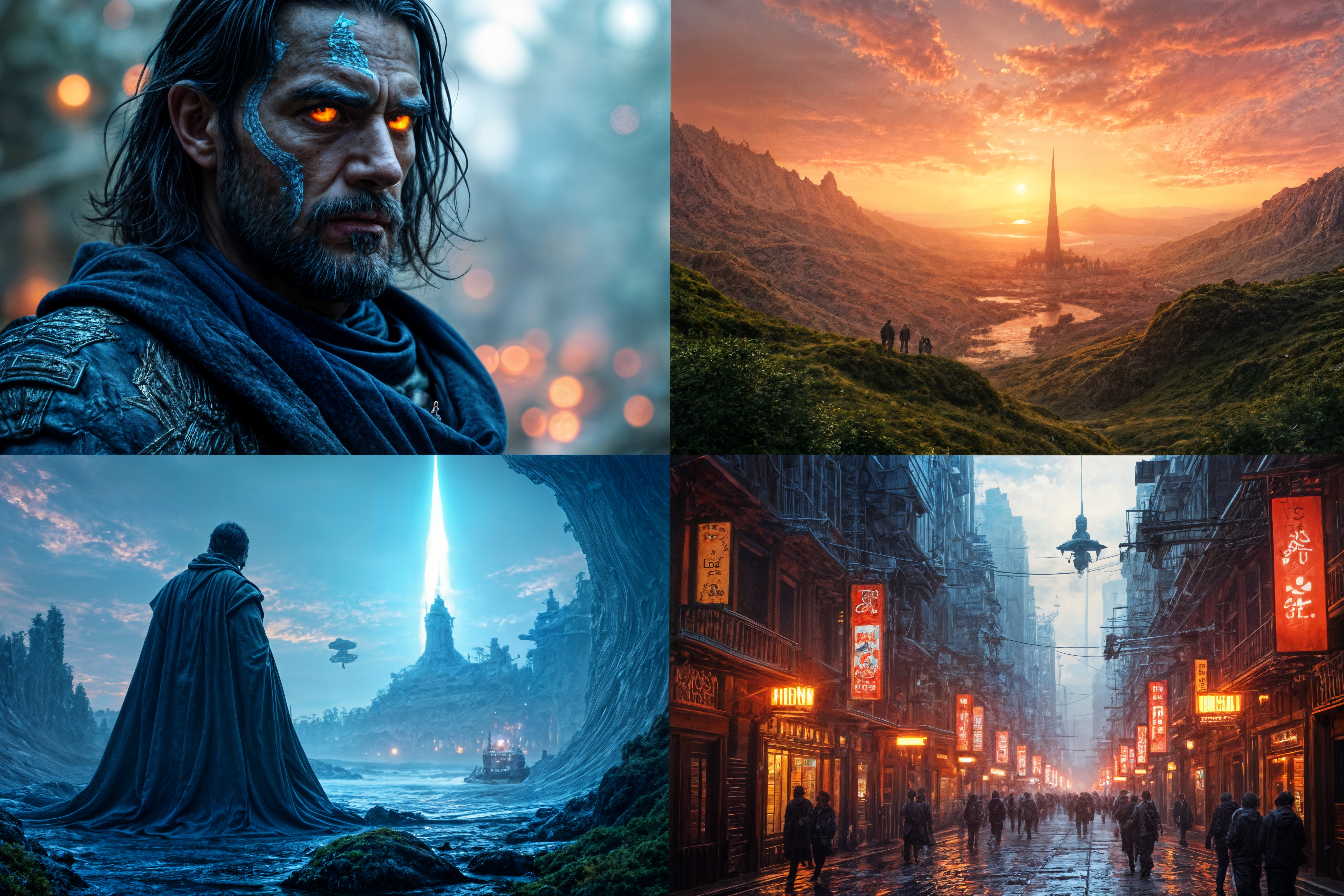 A 2x2 grid inspired by the Final Fantasy universe, composed of four visually distinct images: 1. A highly detailed portrait of a Final Fantasy character, focusing on fantastical elements such as intricate armor, glowing eyes, and ethereal hair. The portrait should capture a blend of realistic skin textures with magical details, subtle yet intense facial expressions, and dramatic, moody lighting reminiscent of the series' iconic style. 2. A breathtaking fantasy landscape with vibrant colors, featuring vast, rolling hills covered in lush, otherworldly vegetation. The scene should include a towering crystal spire in the distance, surrounded by floating islands and ancient ruins. The sky should transition from a deep, mystical blue to a fiery orange as the sun sets, creating a magical atmosphere. 3. A close-up view of an enchanted surface, such as a magically imbued fabric with glowing runes woven into intricate patterns, or the weathered stone of an ancient monument with arcane symbols. This image is designed to test the model’s ability to render the fine details of the texture, including the delicate glow, subtle noise, and otherworldly grain. 4. A dynamic cityscape at dusk within a Final Fantasy metropolis, blending futuristic architecture with elements of fantasy. The scene should be filled with glowing neon signs, hovering airships, and bustling streets lined with a mix of modern skyscrapers and ancient, ornate buildings. The vibrant lights and complex structures challenge the model's ability to maintain color accuracy and handle visual artifacts. Each section should be richly detailed, featuring high contrast, vibrant colors, and a blend of realism and fantasy, challenging the model to handle complex visual elements and maintain the iconic Final Fantasy aesthetic.