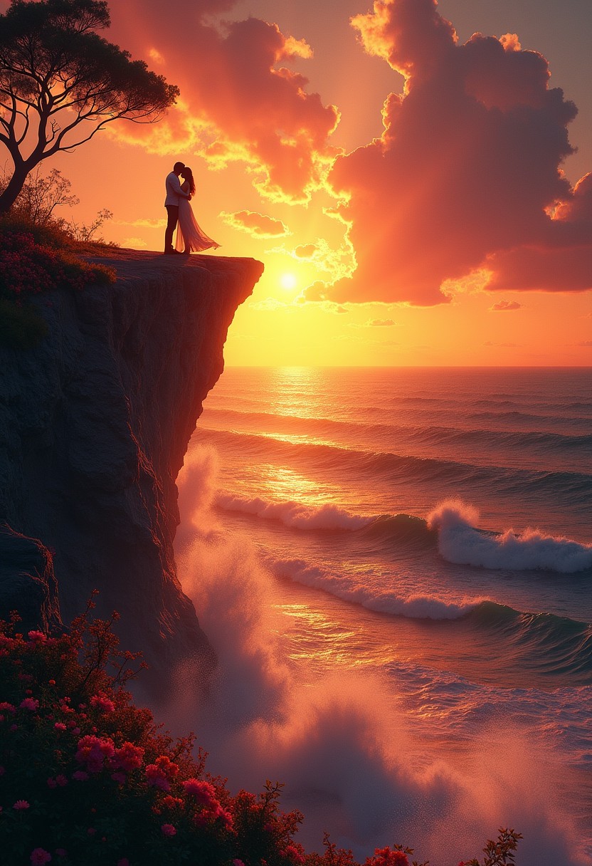 a lush, vibrant landscape under a twilight sky, where golden and crimson hues dance across the horizon. The scene features a dramatic cliff overlooking an expansive, sparkling ocean with fiery hues reflecting on the water. A passionate couple stands at the edge of the cliff, their silhouettes entwined as they embrace passionately, surrounded by a warm, ethereal glow. The environment pulses with energy and heat, as if the very air is charged with their fervent emotions. The landscape itself seems to be alive, with swirling flames subtly integrated into the foliage and ocean waves, creating an atmosphere of intense, romantic adventure.