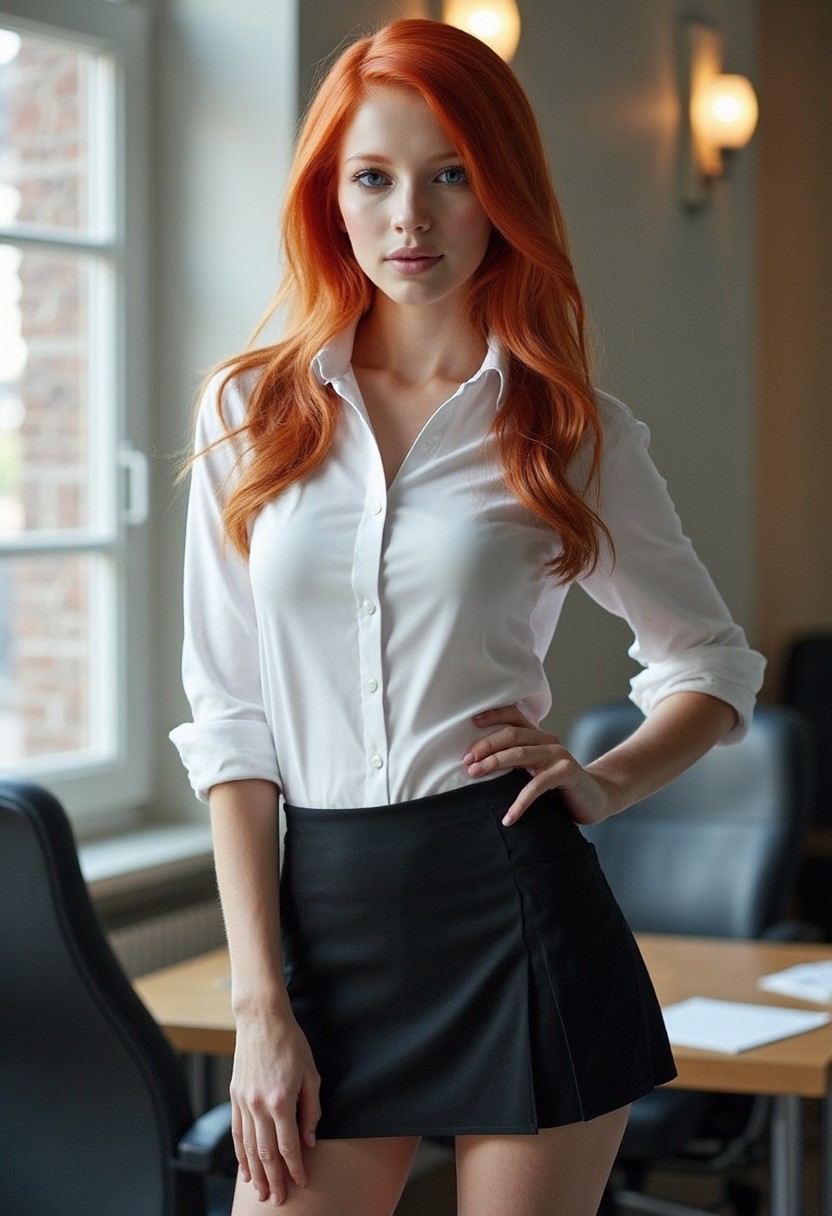 A sophisticated yet daring portrait of an attractive woman styled in an office look with a bold twist. Her fiery red hair is styled elegantly, complementing her crisp white shirt and a provocatively short skirt, paired with classic stockings. The setting is a modern office environment where she stands confidently, her posture both professional and alluring. Her look is completed with a hint of playfulness, striking a balance between corporate chic and sultry charm. This image captures a unique blend of office fashion and provocative elegance, leaving a lasting impression. photo, fashion, full body, canon photo, playboy