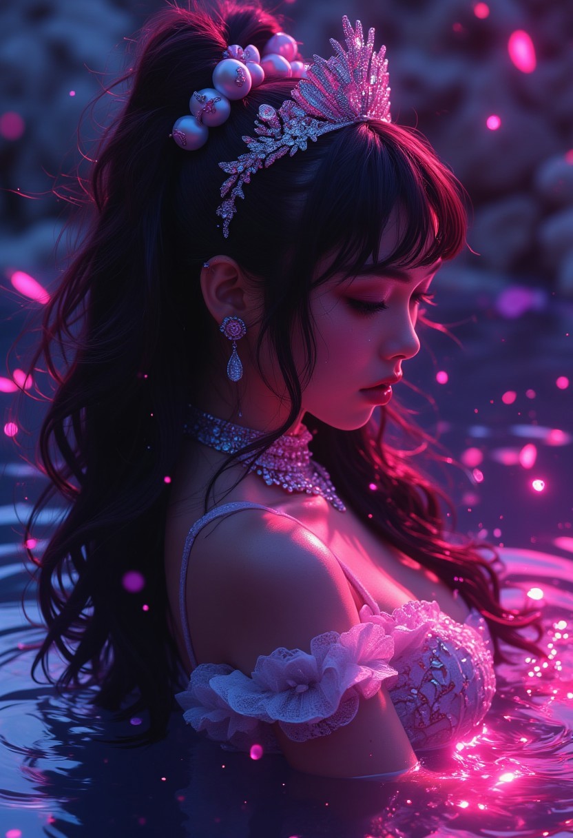 highest quality, 8k, UHD, extreme resolution, 1girl, hair bobbles, silver tiara, diamonds, long hair, floating hair, (masterpiece:1.1), (highest quality:1.1), (HDR:1.0), scenic, water, dark environments, magenta theme, water, reflection, prism
