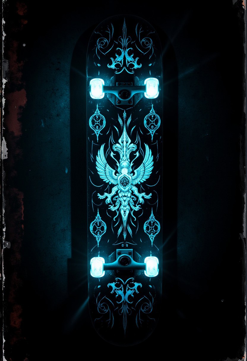 photograph, The Forces of Darkness, Insensitive (Container Skateboard:1.3) , intricate designs, Bathed in shadows, glowy Luminescence, still, Ilford XP2 400, pinhole lens, High Contrast, overly complex style, epic, realism, detailmaximizer, gaming, magic frame, object