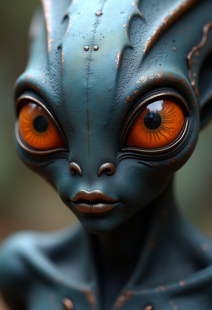 2d art of alien, in the style of textured illustrations, dark gray and bronze, online sculpture, naoto hattori, jeremy lipking, dark sky-blue and orange, intense close-ups