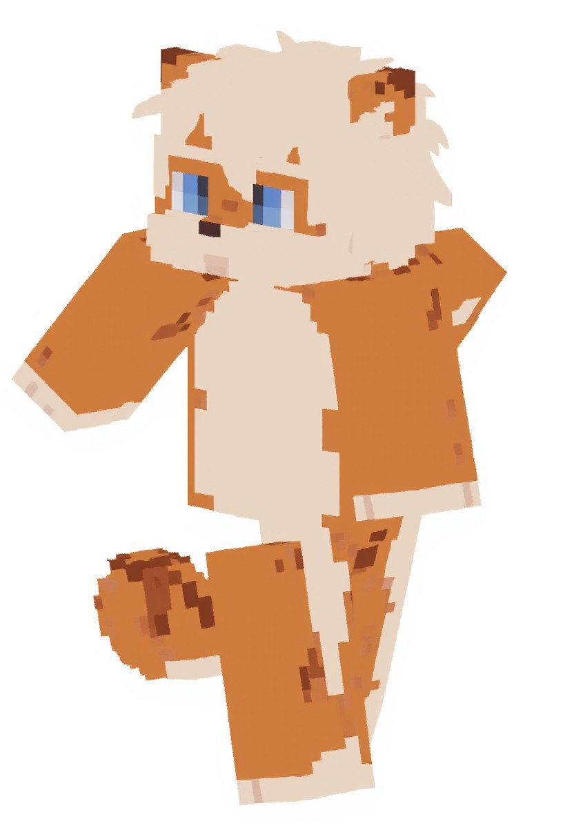 milkytiger in Minecraft style, milkytiger skin He has orange fur and white hair, milkytiger blue eyes he is standing and looking at the viewer on a white background in pixel style
