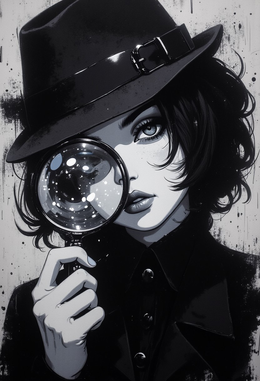 A pen and ink style expressionism painting. Portrait of a female detective scowling into a magnifying glass. The glass is crystal clear, showing a water portal through the glass. The detective is wearing a black suit and fedora that emanates her shadowy figure. Anime art of Detective draped in shadows with a lighting that enhances her unique features. Haunted house setting. Haunted expression, Haunted atmosphere. Ultra detailed artistic abstract. sbfte, de01, detail eyes, magic eyes, 8k.