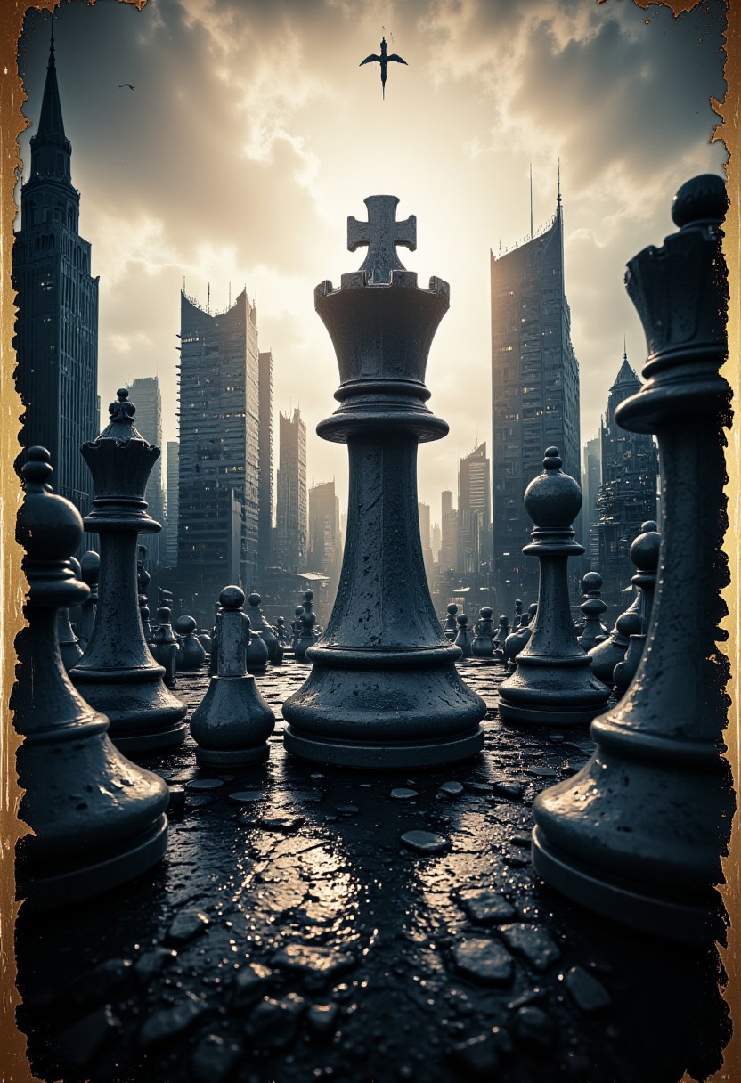stunning Movie Poster of a cityscape where the buildings are all shaped like giant chess pieces. many details, extreme detailed, full of details, Wide range of colors. Many details everywhere. Ray-Tracing. Anti-Aliasing. Realistic soft shadows. Low saturation colors. Insane quality. Insane resolution. Insane details. Masterpiece. 32k resolution. Dramatic,Dynamic,Cinematic,Sharp details detailmaximizer,gaming, magic gold frame, silver object