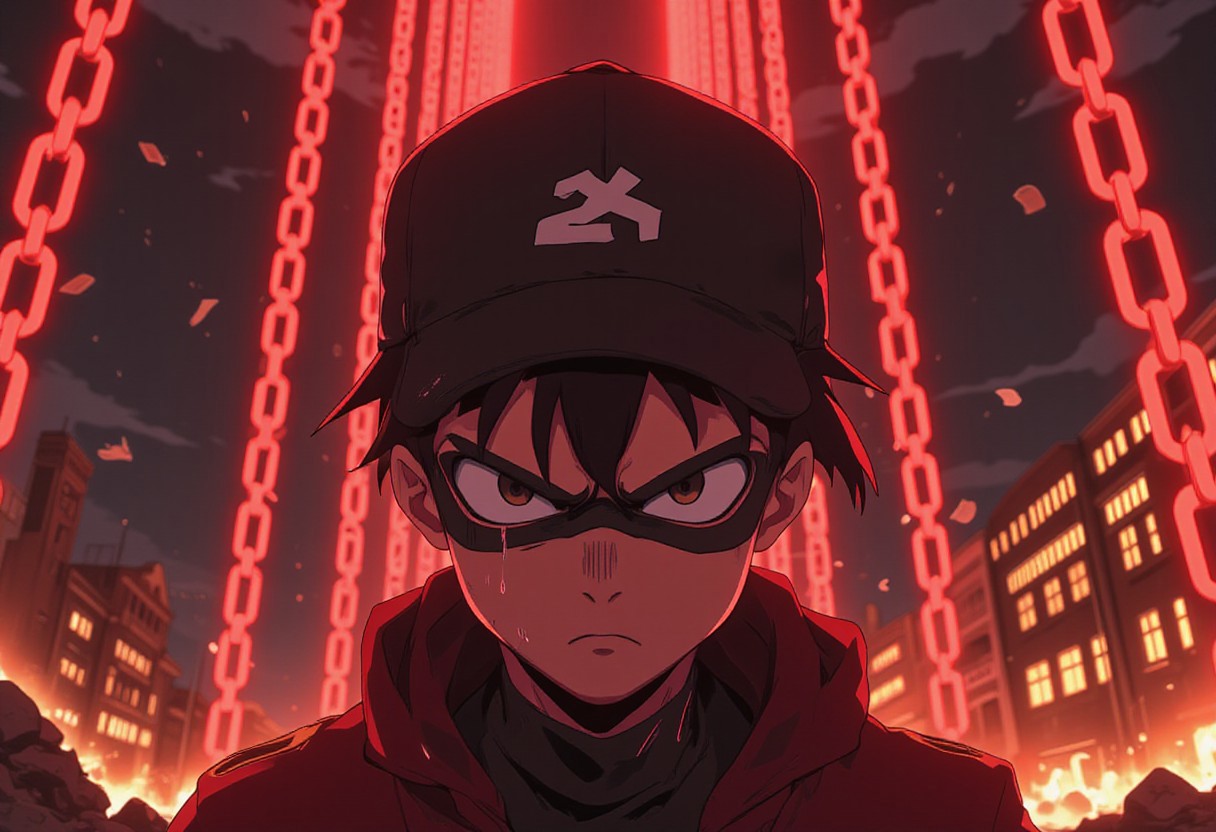 a 20-year-old guy in the spotlight, with black hair, wearing a black cap and mask, levitating red glowing steel chains behind his back, destroyed city behind him.