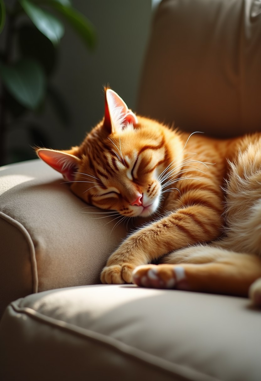 (Warm orange tones, relaxed slumber) A large, ginger cat reclines comfortably on a sofa, its fur softly catching the light. The cat's body is relaxed, with its head tilted down as it drifts into sleep. [The background is soft and blurred], allowing the cat's warm fur and peaceful posture to dominate the scene. (Emphasize the contrast between the cat’s warm orange fur and the muted tones of the surroundings), creating a cozy and serene atmosphere. [Focus on the fur’s texture] to enhance the sense of comfort and tranquility